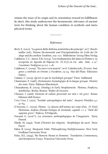 吀栀e article studies the motif of the descent of the soul in the Homeric Hymn to Demeter (H. Hom. 2.1–46) and in Plotinus’ Ennead 4.8.1. If we consider that myth is a form of orientation in the world, that is, a form of thought, and that metaphysics is one of its possible lines of continuity, we could argue that both texts — although distant in time and genre — express the same symbolic structure: the departure from the divine principle, the experience of loss, and the possibility of return. In the Homeric Hymn to Demeter, the abduction of Persephone triggers a cosmic crisis that can only be resolved through the establishment of the Mysteries, which o昀昀er a path of ritual and ontological reintegration. In the Ennead 4.8.1, the fall of the soul is conceived as a process that does not compromise its entire essence: a part always remains in the Intellect, which enables the return through contemplation. In both cases, we propose that the descent does not represent a de昀椀nitive degradation but rather a necessary stage in the soul’s journey toward knowledge and the restoration of its original condition.