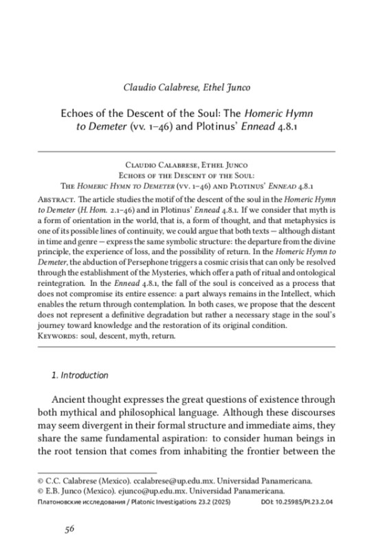 Древняя мысль выражала великие вопросы бытия как в мифическом, так и в философском ключе. Несмотря на то, что эти дискурсы могут различаться по своей формальной структуре и непосредственным целям, их объединяет одно фундаментальное стремление: рассмотреть человека в его изначальном противоречии, возникающем из-за того, что он находится на границе между чувственным и умопостигаемым. В этой статье мы исследуем момент сближения этих двух регистров: в гомеровском гимне Деметре (H. Hom. 2.21–46) и в “Эннеаде” Плотина ( 4.8.1). В этой работе утверждается, что оба текста посвящены драме души: ее падению, ее единению с телом, и его желание вернуться к полноте своего истока.