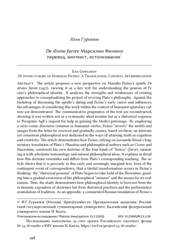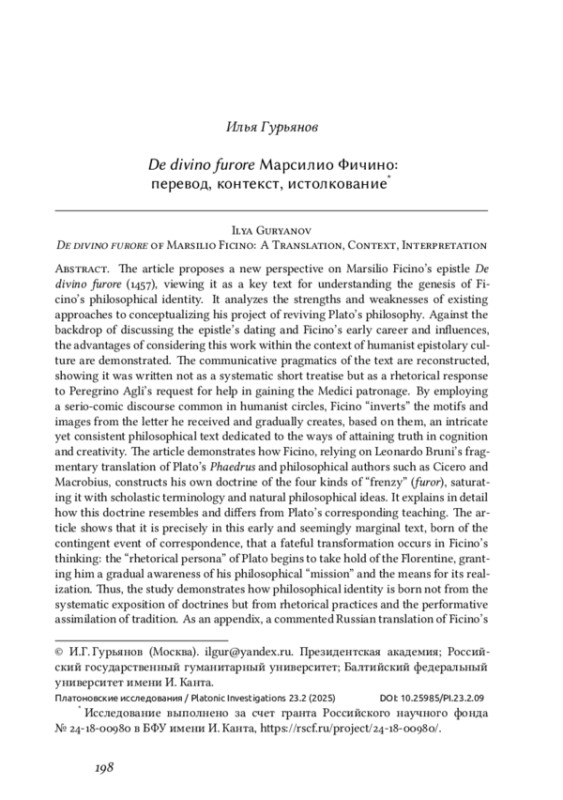 Статья предлагает новый взгляд на парадигматическое для ренессансного платонизма послание Марсилио Фичино «О божественном неистовстве» (1457) с точки зрения проблемы генезиса философской идентичности флорентийского мыслителя и выбора соответствующих ей конкретных герменевтических стратегий. Анализируются сильные и слабые стороны существующих подходов к концептуализации его проекта возрождения учения Платона. На фоне обсуждения датировки послания и интеллектуальных влияний, испытанных Фичино к моменту его написания, показываются преимущества рассмотрения данного произведения в контексте гуманистической эпистолярной культуры. Реконструируется коммуникативная прагматика текста, написанного не как систематический трактат малой формы, а как риторический ответ на просьбу Перегрино Альи о помощи в получении покровительства дома Медичи. Используя распространенный в гуманистической среде серьезно-иронический дискурс, Фичино «переворачивает» мотивы и образы полученного им письма и постепенно создает на их основе прихотливый, но последовательный философский текст, посвященный способам достижения истины в познании и творчестве. Показывается, как Фичино, опираясь на фрагментарный перевод платоновского диалога «Федр», выполненный Леонардо Бруни, и авторитеты вроде Цицерона и Макробия, конструирует собственное учение о четырех видах «неистовства» (furor), насыщая его схоластической терминологией и натурфилософскими идеями. Подробно поясняется, в чем именно оно сходно и чем отличается от соответствующего учения Платона. Доказывается, что именно в этом раннем и, казалось бы, маргинальном тексте, порожденном контингентным событием переписки, происходит судьбоносная трансформация мышления Фичино: «риторическая персона» Платона начинает овладевать флорентийцем, давая ему постепенное осознание философской «миссии» и средства для ее реализации. Всё это демонстрирует, как философская идентичность рождается не из систематического изложения доктрин, а из риторических практик и перформативного усвоения традиции. В приложении приводится комментированный перевод послания Фичино «О божественном неистовстве», а также прозаической и фрагмента поэтической части письма Альи.