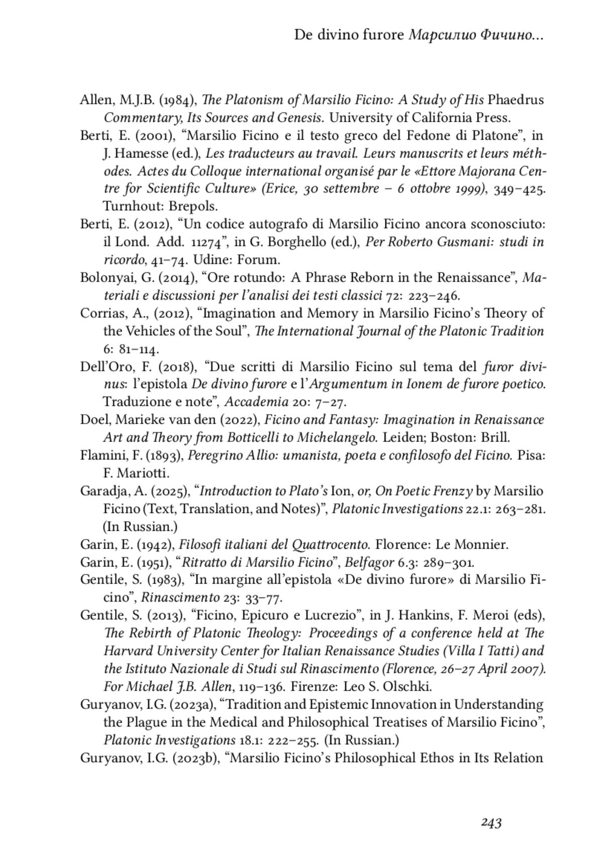 20. Garadja, A. (2025), “Introduction to Plato’s Ion, or, On Poetic Frenzy by Marsilio Ficino (Text, Translation, and Notes)”, Platonic Investigations 22.1: 263-281.(In Russian.). EDN: BVWMRE