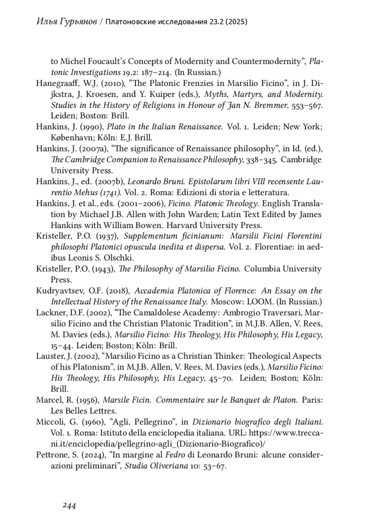 26. Guryanov, I.G. (2023b), “Marsilio Ficino’s Philosophical Ethos in Its Relation to Michel Foucault’s Concepts of Modernity and Countermodernity”, Platonic Investigations 19.2: 187-214. (In Russian.). EDN: YQOVLR