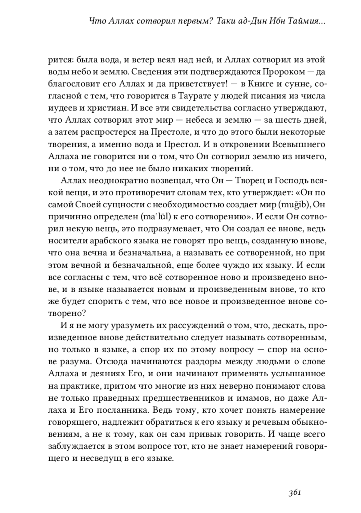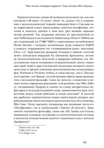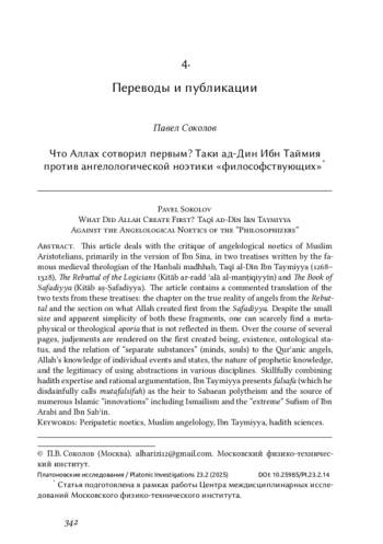 Статья посвящена критике ангелологической ноэтики мусульманских перипатетиков, преимущественно в версии Ибн Сины, в двух трактатах знаменитого средневекового теолога ханбалитского мазхаба Таки ад-Дина Ибн Таймии (1263-1328) «Опровержении логиков» (Kitāb ar-radd ʿalā al-manṭiqiyyīn) и «Книге Сафадия» (Kitāb aṣ-Ṣafadiyya). В приложении к статье приведен комментированный перевод двух соответствующих разделов из этих трактатов: главы, посвященной подлинной реальности ангелов, из «Опровержения», и раздела о том, что́ Аллах сотворил первым, из «Сафадии». Несмотря на малый размер и кажущуюся простоту обоих этих фрагментов, трудно найти такую метафизическую или теологическую апорию, которая не нашла бы в них своего отражения. На нескольких страницах здесь выносятся решения о первом сотворенном, существовании, онтологическом статусе и отношении «отделенных субстанций» (умов, душ) к кораническим ангелам, познании Аллахом единичных событий и состояний, природе пророческого ве́дения, легитимности использования абстракций в разных видах наук. Искусно сопрягая хадисоведческую и рациональную аргументацию, Ибн Таймия представляет фальсафу (которую он презрительно именует «мутафальсифой») как наследницу сабейского многобожия и источник множества исламских «ересей», включая исмаилизм и «крайний» суфизм Ибн Араби и Ибн Сабʿина.