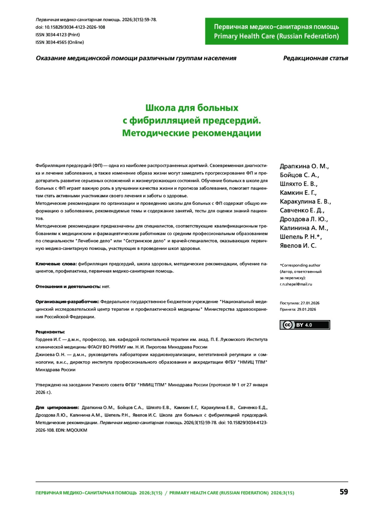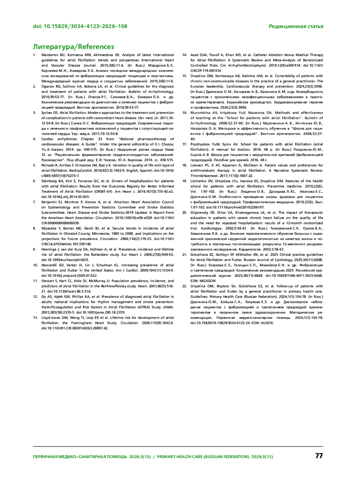 22. Драпкина О. М., Бойцов С. А., Голухова Е. З. и др. Диспансерное наблюдение пациентов с фибрилляцией и трепетанием предсердий врачом-терапевтом в первичном звене здравоохранения. Методические рекомендации. Первичная медико-санитарная помощь. 2024;1(1):134-78.