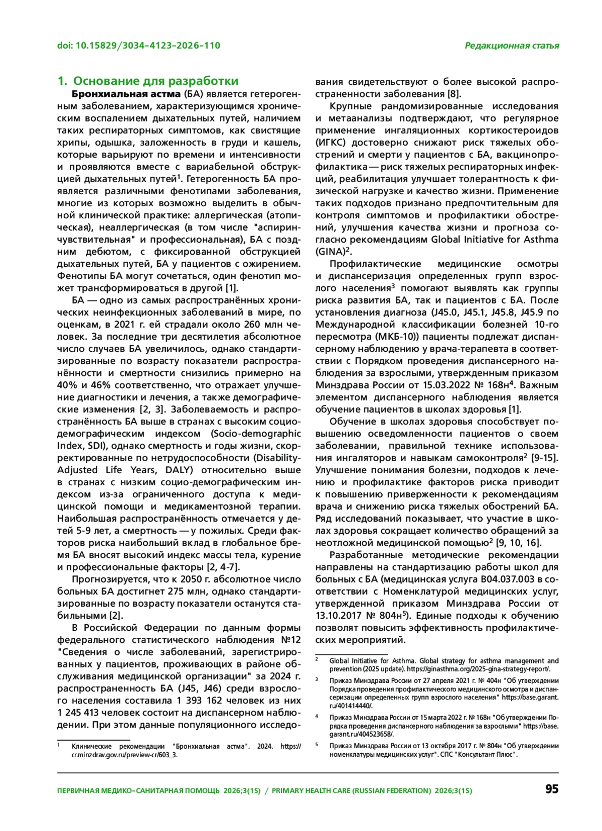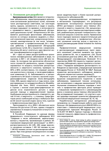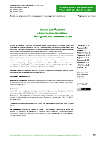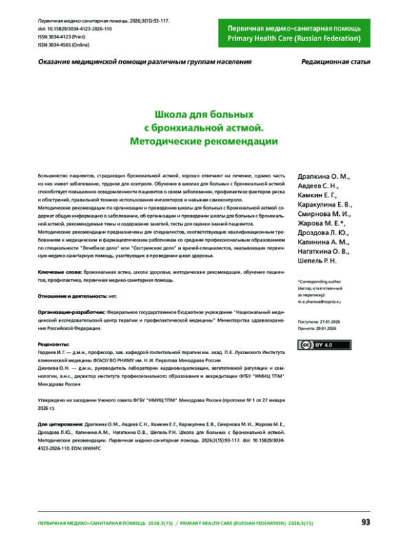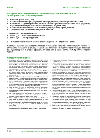 1. Драпкина О. М., Авдеев С. Н., Смирнова М. Е. и др. Диспансерное наблюдение пациентов с бронхиальной астмой врачом-терапевтом в первичном звене здравоохранения. Методические рекомендации. Первичная медико-санитарная помощь. 2025;2(2):165-205. DOI: 10.15829/3034-4123-2025-43