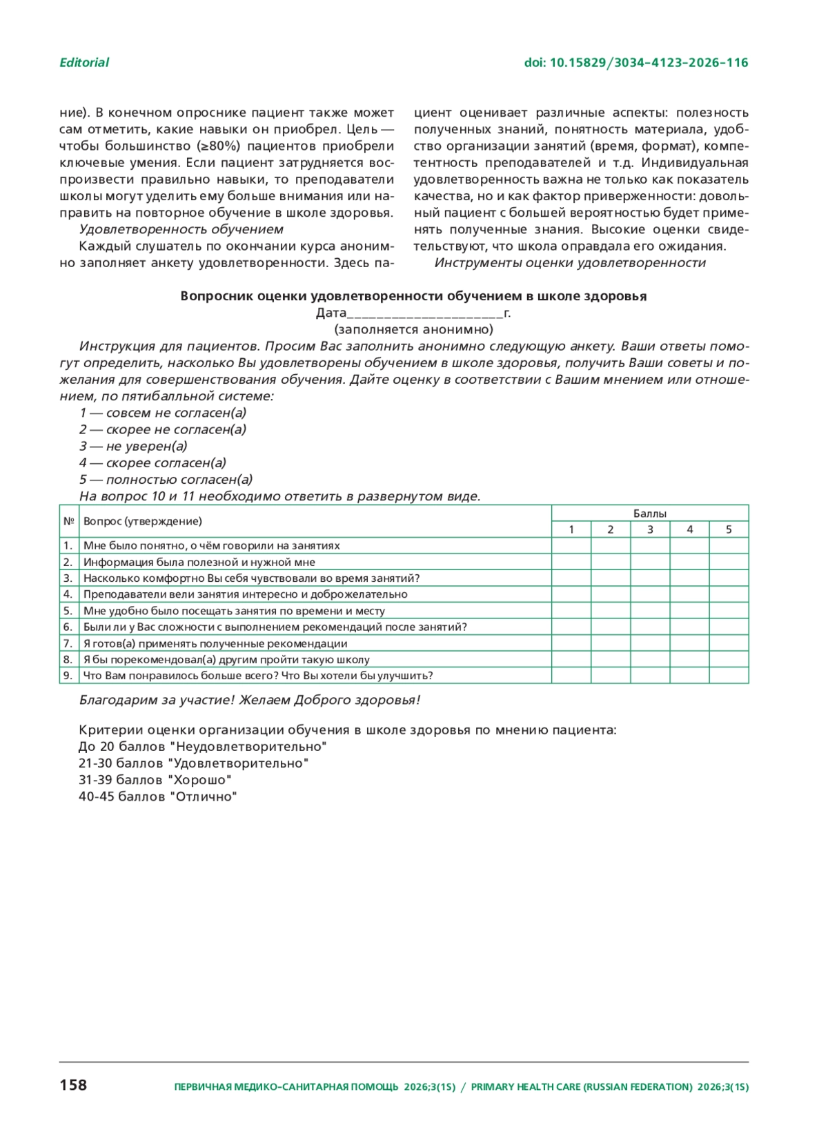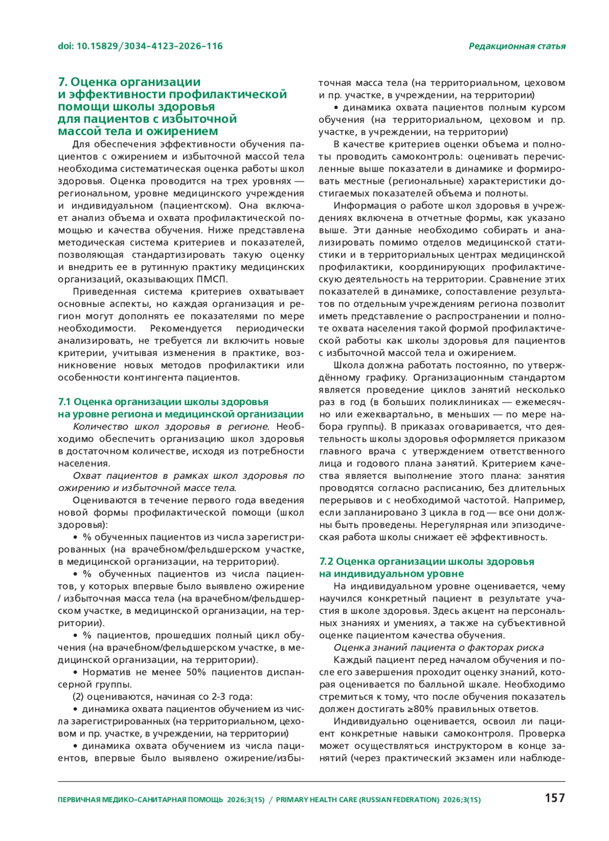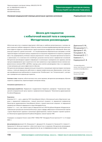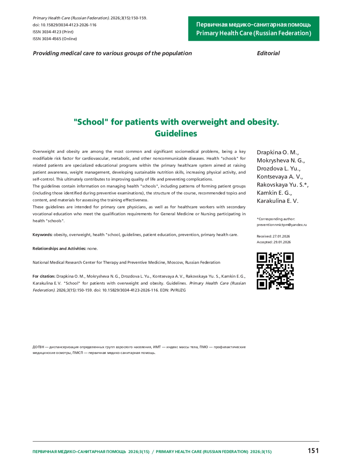 Избыточная масса тела и ожирение представляют собой одну из наиболее распространенных и значимых медико-социальных проблем современного общества, являясь ключевым модифицируемым фактором риска развития сердечно-сосудистых, метаболических и других хронических неинфекционных заболеваний. Школы здоровья для пациентов с данной патологией — это специализированные образовательные программы в системе первичной медико-санитарной помощи, направленные на повышение осведомленности пациентов, коррекцию массы тела, формирование устойчивых навыков рационального питания, повышения физической активности и самоконтроля, что в конечном итоге способствует улучшению качества жизни и профилактике осложнений. Методические рекомендации содержат информацию по организации и проведению школ здоровья, включая принципы формирования групп пациентов (в том числе выявленных в ходе профилактических осмотров профилактических осмотров (ПМО и ДОГВН)), структуру цикла занятий, рекомендуемые темы и их содержание, а также материалы для оценки эффективности обучения.