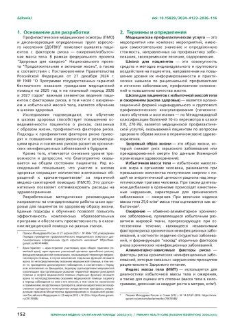 Профилактические медицинские осмотры (ПМО) и диспансеризация определенных групп взрослого населения (ДОГВН) 1 помогают выявлять пациентов с фактором риска — ожирение/избыточная масса тела. В рамках федерального проекта “Здоровье для каждого” Национального проекта “Продолжительная и активная жизнь”, а также в соответствии с Постановлением Правительства Российской Федерации от 27 декабря 2024 г. № 1940 “О Программе государственных гарантий бесплатного оказания гражданам медицинской помощи на 2025 год и на плановый период 2026 и 2027 годов” важным элементом ведения пациентов с факторами риска, в том числе с ожирением и избыточной массой тела, является обучение в школах здоровья.