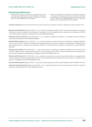 2. Драпкина О. М., Дроздова Л. Ю., Концевая А. В. и др. Оказание медицинской помощи пациентам с факторами риска развития хронических неинфекционных заболеваний в центрах здоровья для взрослых. Методические рекомендации. М.: РОПНИЗ, ООО “СИЛИЦЕЯ-ПОЛИГРАФ” 2025 г. 164 с. 978-5-6053845-8-8.