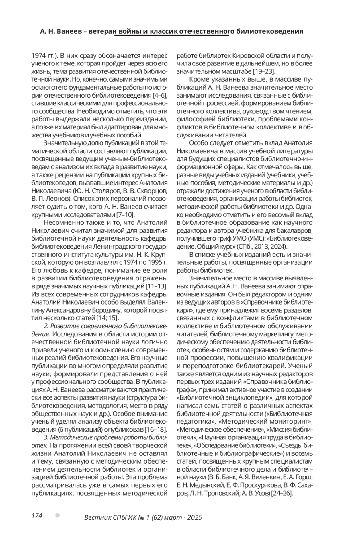 Значительную долю публикаций в этой тематической области составляют публикации, посвященные ведущим ученым-библиотековедам с анализом их вклада в развитие науки, а также рецензии на публикации крупных библиотековедов, вызвавшие интерес Анатолия Николаевича (Ю. Н. Столяров, В. В. Скворцов, В. П. Леонов). Список этих персоналий позволяет судить о том, кого А. Н. Ванеев считает крупными исследователями [7–10]. Несомненно также и то, что Анатолий Николаевич считал значимой для развития библиотечной науки деятельность кафедры библиотековедения Ленинградского государственного института культуры им. Н. К. Крупской, которую он возглавлял с 1974 по 1995 г. Его любовь к кафедре, понимание ее роли в развитии библиотековедения отражены в ряде значимых научных публикаций [11–13]. Из всех современных сотрудников кафедры Анатолий Николаевич особо выделял Валентину Александровну Бородину, которой посвятил несколько статей [14; 15].
