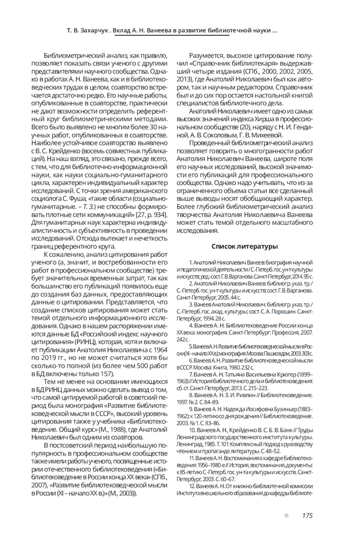 20. Ванеев А. Н. Вопросы совершенствования организационно-методической деятельности // Научные и технические библиотеки СССР. 1985. № 1. С. 8-14.