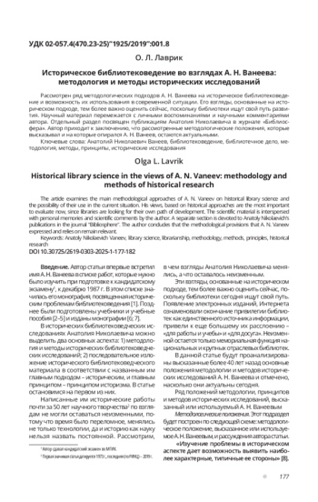 Рассмотрен ряд методологических подходов А. Н. Ванеева на историческое библиотековедение и возможность их использования в современной ситуации. Его взгляды, основанные на историческом подходе, тем более важно оценить сейчас, поскольку библиотеки ищут свой путь развития. Научный материал перемежается с личными воспоминаниями и научными комментариями автора. Отдельный раздел посвящен публикациям Анатолия Николаевича в журнале «Библиосфера». Автор приходит к заключению, что рассмотренные методологические положения, которые высказывал и на которые опирался А. Н. Ванеев, остаются актуальными.