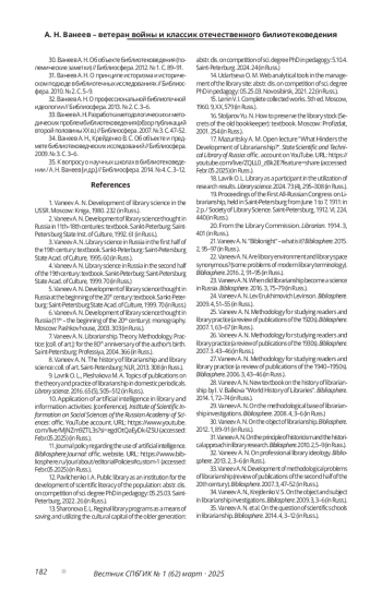 5. Ванеев А. Н. Развитие библиотековедческой мысли в России в начале XX века: учеб. пособие. Санкт-Петербург: С.-Петерб. гос. акад. культуры, 1999. 70 с. EDN: ZUTHDP