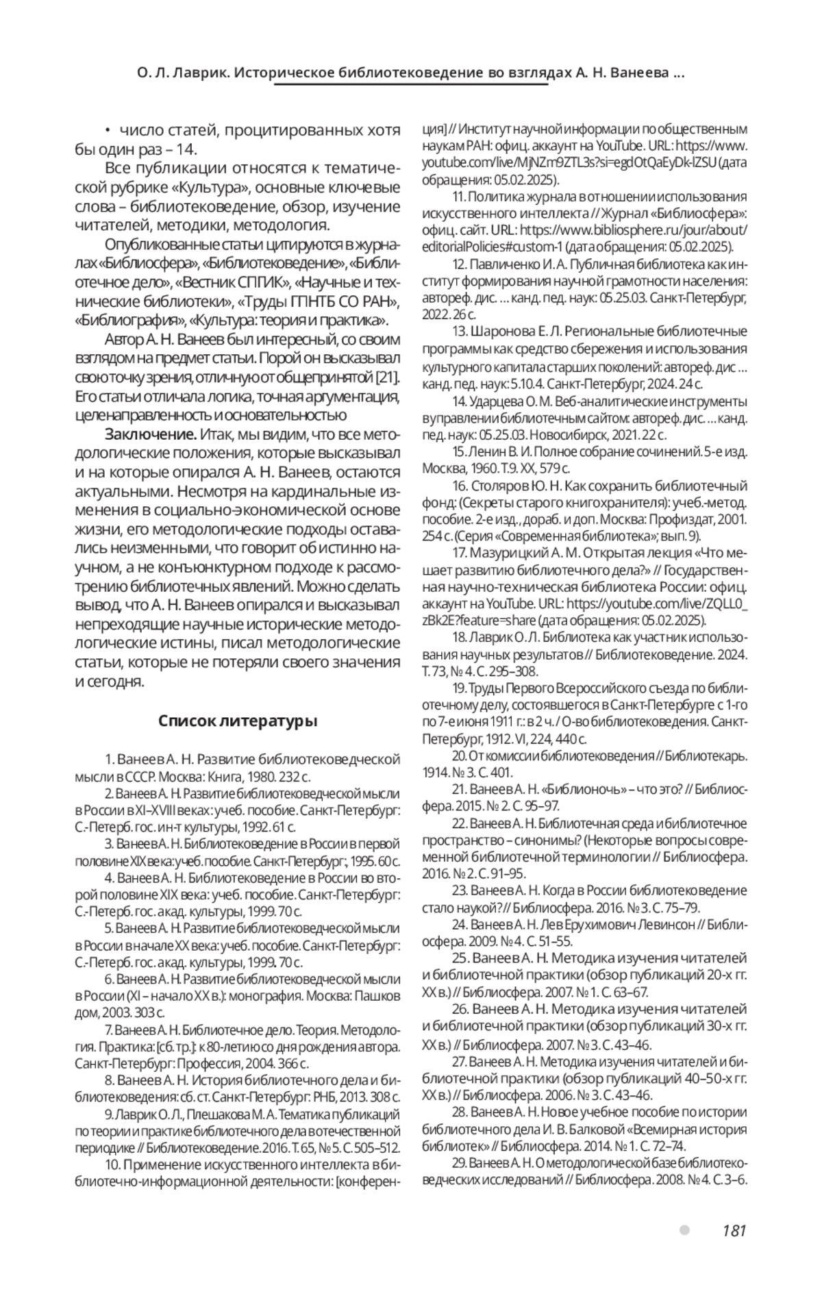 23. Ванеев А. Н. Когда в России библиотековедение стало наукой? // Библиосфера. 2016. № 3. С. 75-79. EDN: WMUFQJ