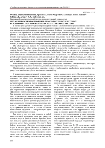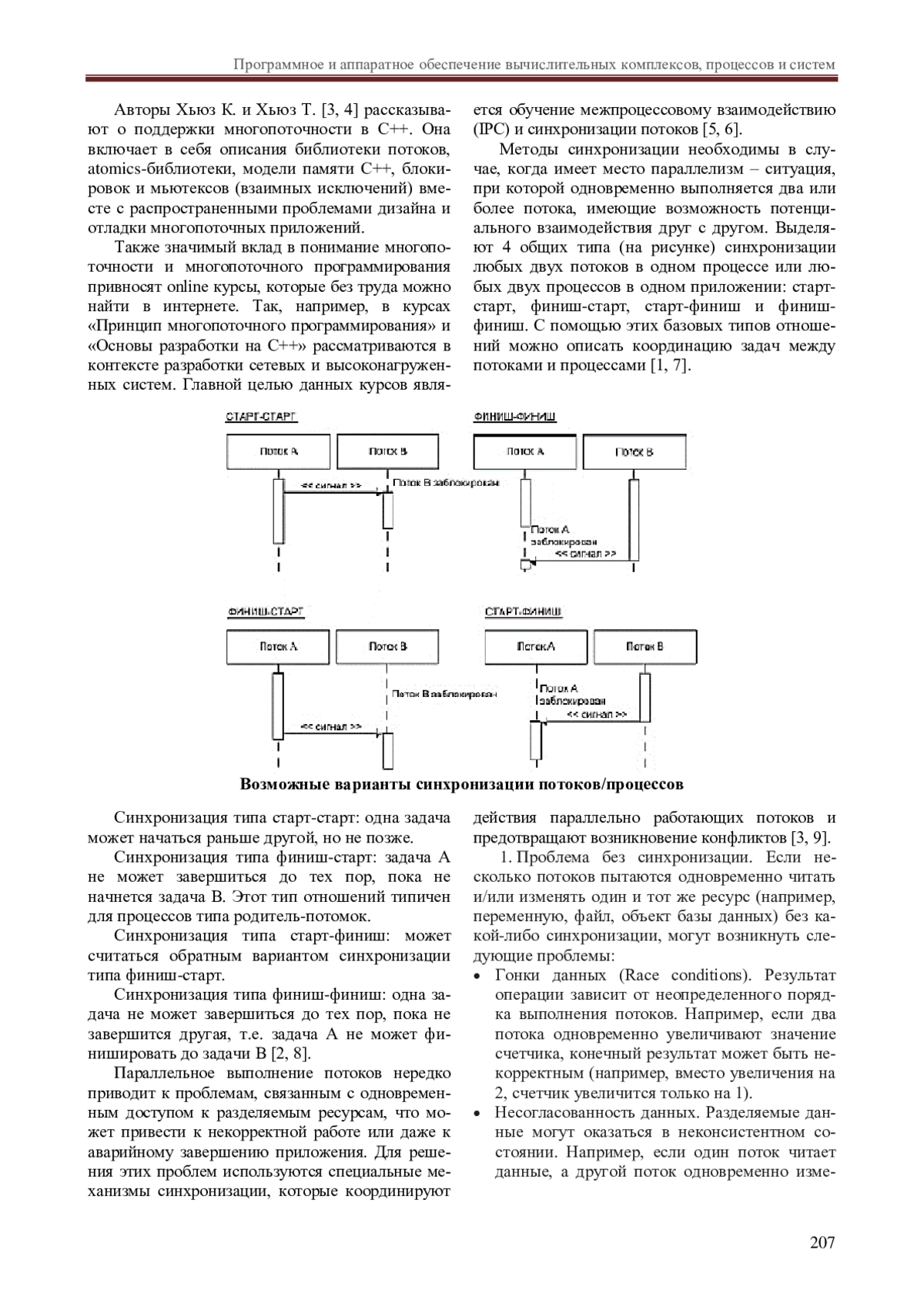 В статье приводятся методы синхронизации потоков в многопоточном приложении на языке C++. Основная возникающая трудность при написании программ для параллельных систем - синхронизация одновременно работающих потоков. Выделяют 4 общих типа синхронизации потоков в одном процессе или процессов в одном приложении: старт-старт, финиш-старт, старт-финиш и финиш-финиш. С помощью этих основных типов отношений можно описать координацию задач между потоками и процессами. В статье рассматриваются как локальные, так и глобальные механизмы синхронизации, с акцентом на их преимущества и недостатки, а также приводятся примеры использования. Особое внимание уделяется таким аспектам, как критические секции, семафоры, мьютексы, мониторы, а также механизмам блокировки и недетерминированности в многопоточных средах.