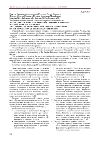 Животноводство является одной из ключевых отраслей агропромышленного комплекса России, играющей важную роль в обеспечении продовольственной безопасности страны и удовлетворении потребностей населения в высококачественных продуктах питания. В условиях глобализации и стремительного научно-технического прогресса, животноводство сталкивается с необходимостью внедрения инновационных технологий и методов управления, что становится особенно актуальным в свете современных вызовов, таких как изменение климата, рост населения и увеличение потребления мясных и молочных продуктов [1, 5].