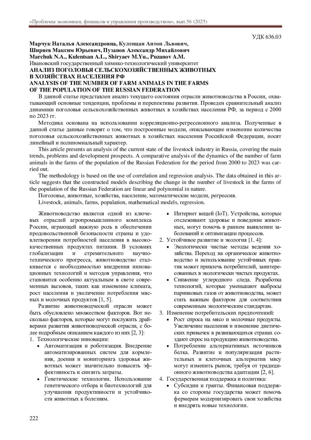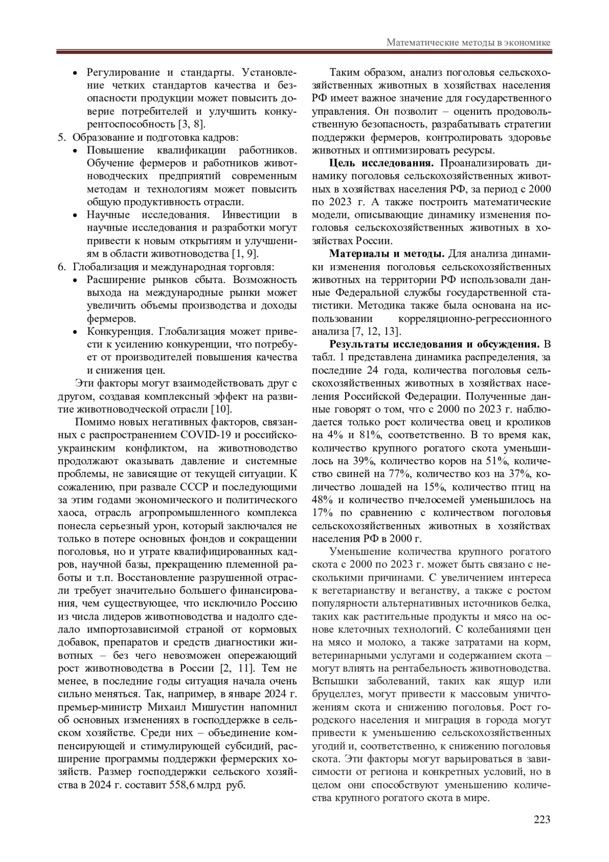 1. Узденова М.А. Анализ отрасли животноводства в России. Вестник науки. 2024. Т 3. № 12(81). С. 446-452. EDN: BYCRDD