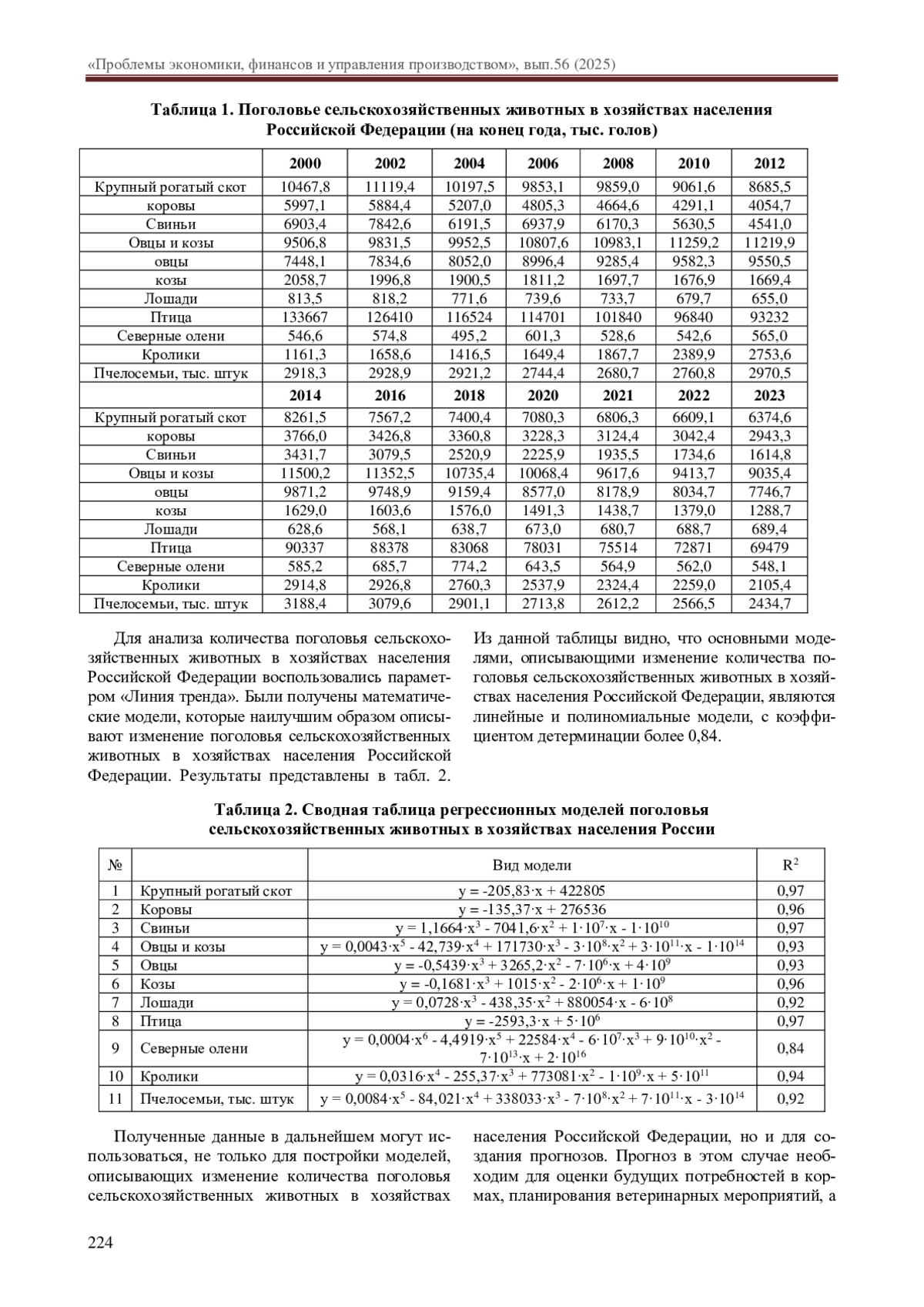 В данной статье представлен анализ текущего состояния отрасли животноводства в России, охватывающий основные тенденции, проблемы и перспективы развития. Проведен сравнительный анализ динамики поголовья сельскохозяйственных животных в хозяйствах населения РФ, за период с 2000 по 2023 гг. Методика основана на использовании корреляционно-регрессионного анализа. Полученные в данной статье данные говорят о том, что построенные модели, описывающие изменение количества поголовья сельскохозяйственных животных в хозяйствах населения Российской Федерации, носят линейный и полиномиальный характер.
