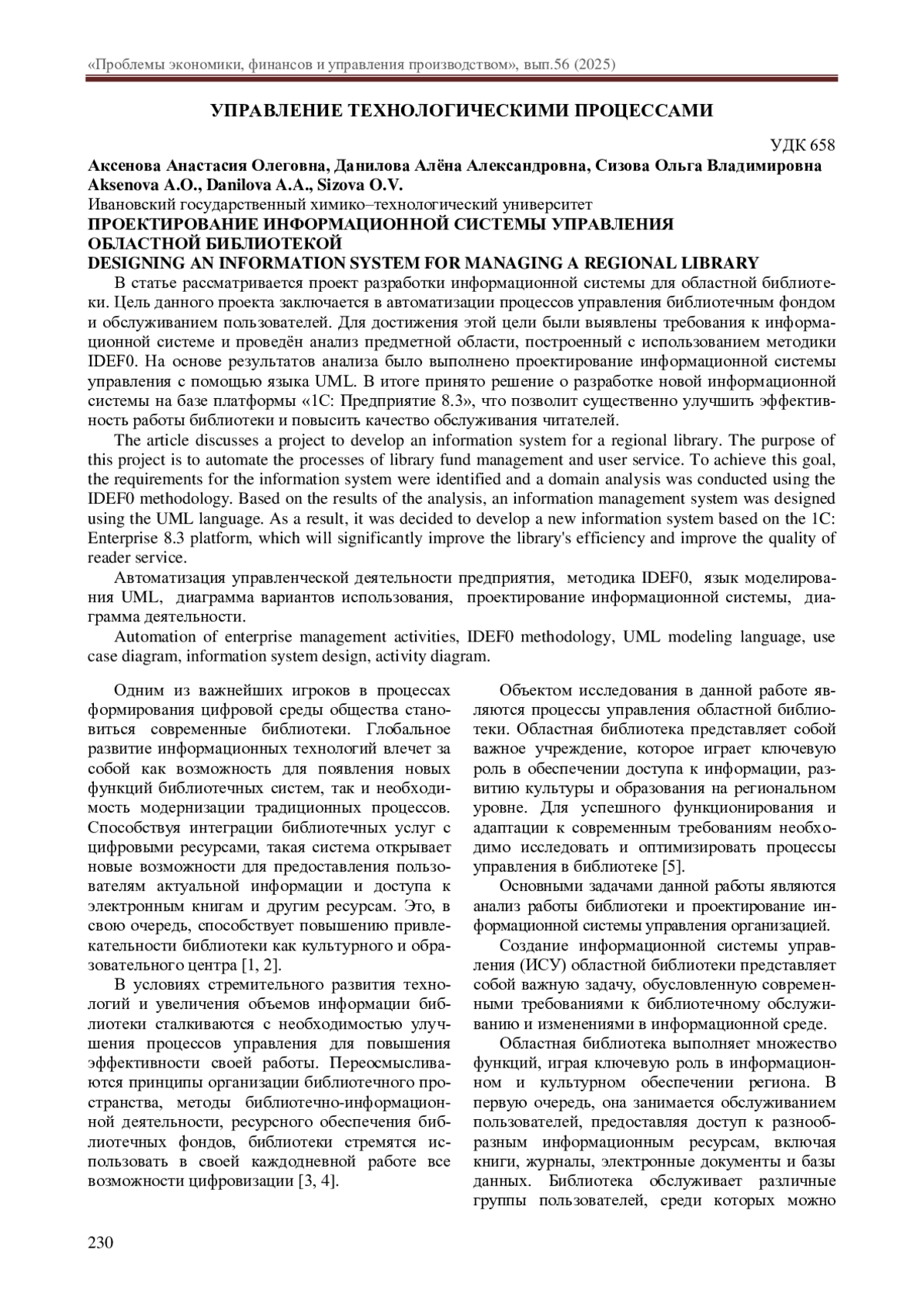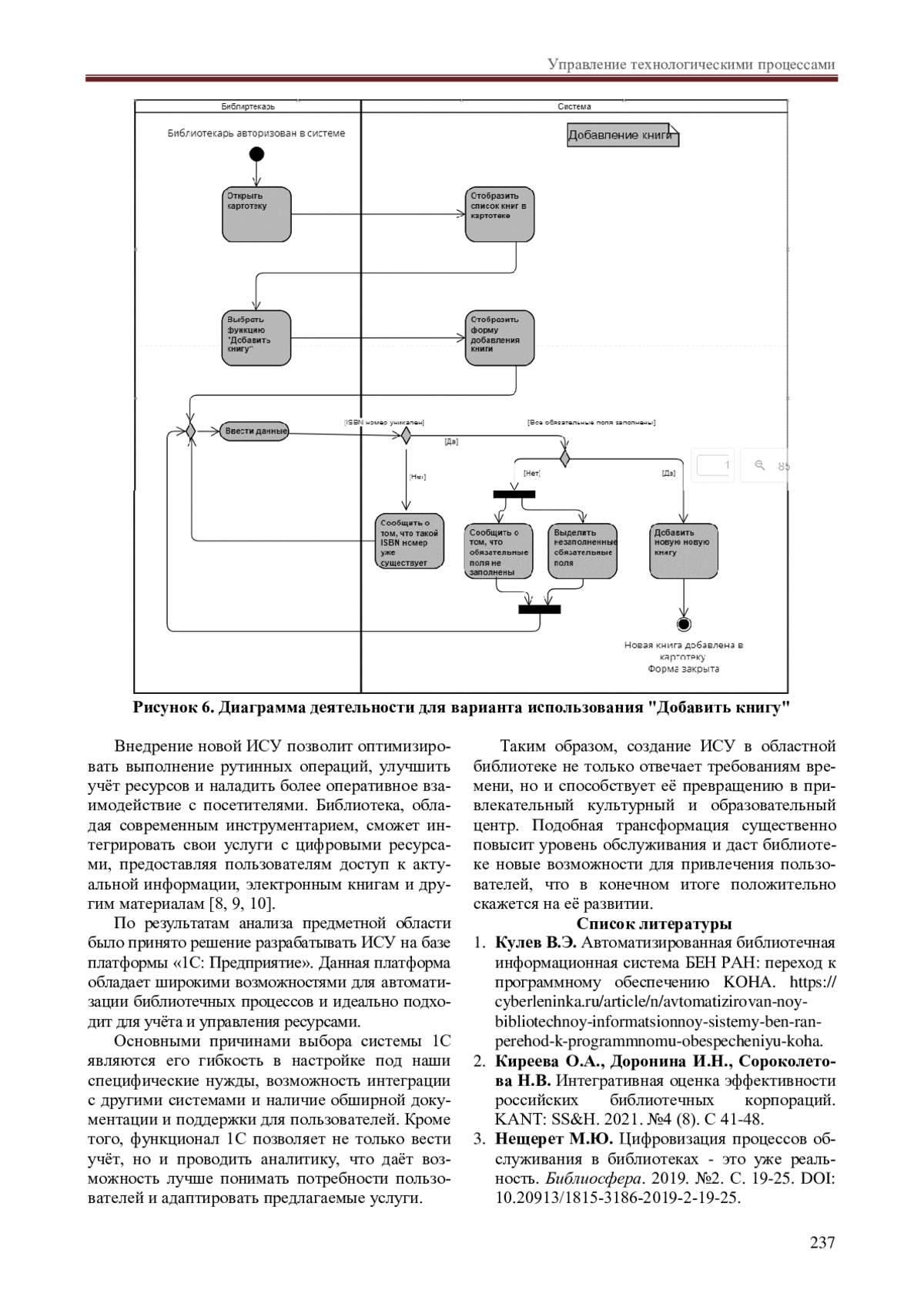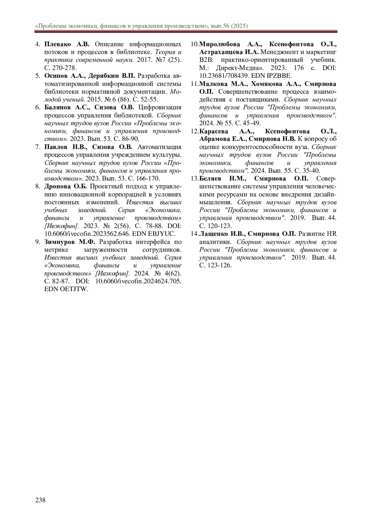 6. Балянов А.С., Сизова О.В. Цифровизация процессов управления библиотекой. Сборник научных трудов вузов России “Проблемы экономики, финансов и управления производством”. 2023. Вып. 53. С. 86-90. EDN: JSMVWQ