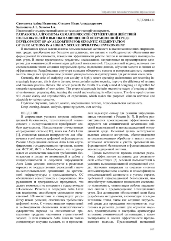 В настоящее время задачи анализа пользовательской активности в высокозащищенных операционных средах приобретают все большую актуальность, это связано с необходимостью обеспечения информационной безопасности, повышения эффективности работы систем и минимизации потенциальных угроз. В статье представлены результаты исследования, направленные на проектирование алгоритма для семантической сегментации действий пользователей. Предложенный подход включает последовательные этапы создания виртуальной среды, подготовки данных, обучения модели и оценки её эффективности. Разработанная структура позволит обеспечить ясность и воспроизводимость экспериментов, что делает предложенное решение универсальным и адаптируемым для различных сценариев.