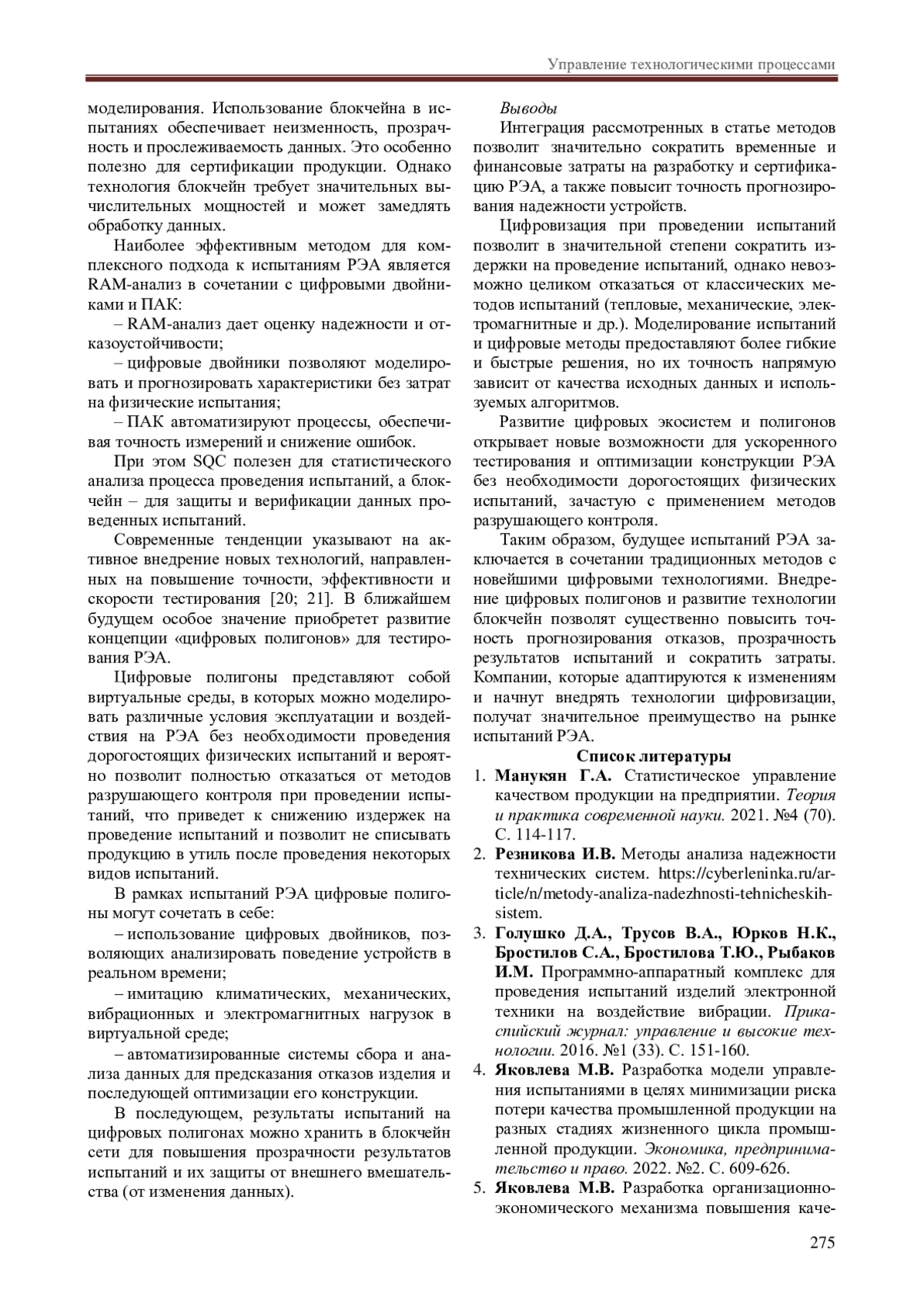 4. Яковлева М.В. Разработка модели управления испытаниями в целях минимизации риска потери качества промышленной продукции на разных стадиях жизненного цикла промышленной продукции. Экономика, предпринимательство и право. 2022. №2. С. 609-626. EDN: BKNNPS