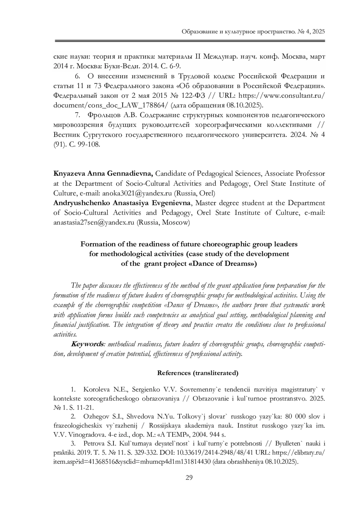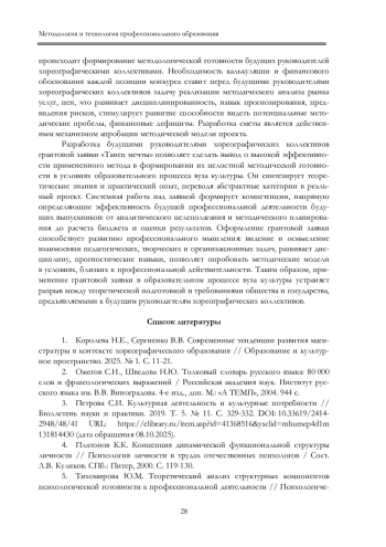 1. Королева Н.Е., Сергиенко В.В. Современные тенденции развития магистратуры в контексте хореографического образования // Образование и культурное пространство. 2025. № 1. С. 11-21. EDN: XHDMAR