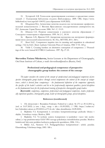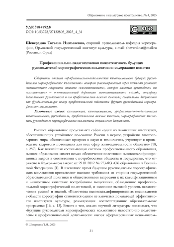 16. Королева Н.Е., Сергиенко В.В. Современные тенденции развития магистрату ры в контексте хореографического образования // Образование и культурное пространство. 2025. № 1. С. 11-21. EDN: XHDMAR