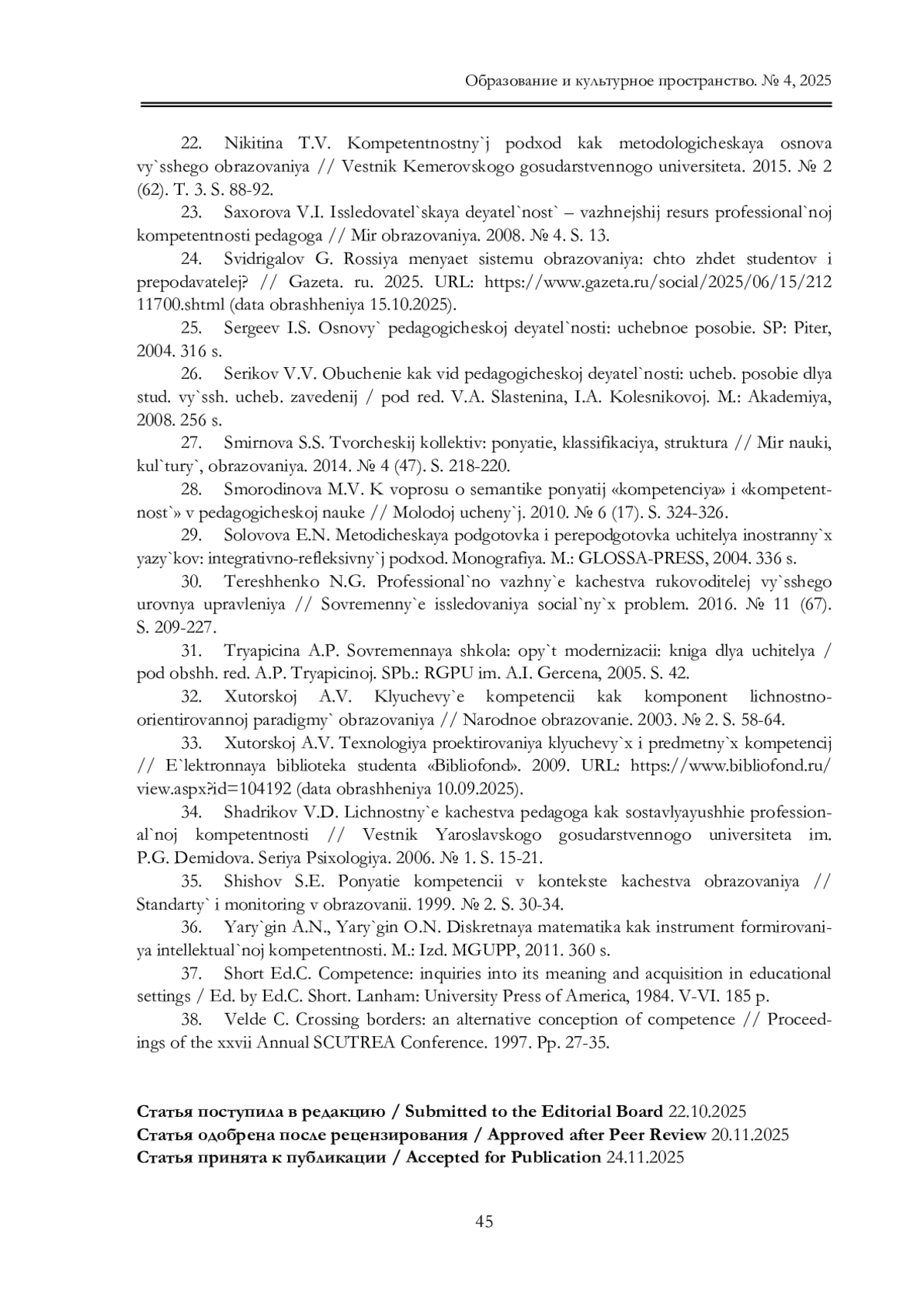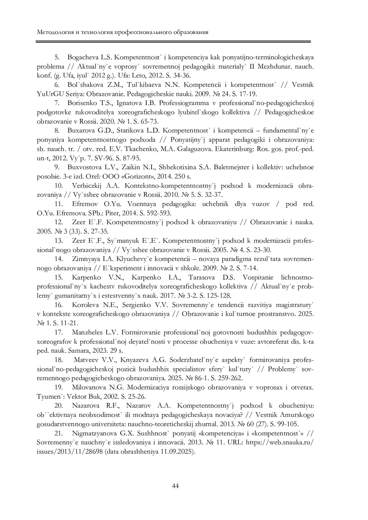 21. Нигматзянова Г.Х. Сущность понятий “компетенция” и “компетентность” // Современные научные исследования и инновации. 2013. № 11. URL: https://web.snauka.ru/ issues/2013/11/28698 (дата обращения 11.09.2025). EDN: RPVORZ