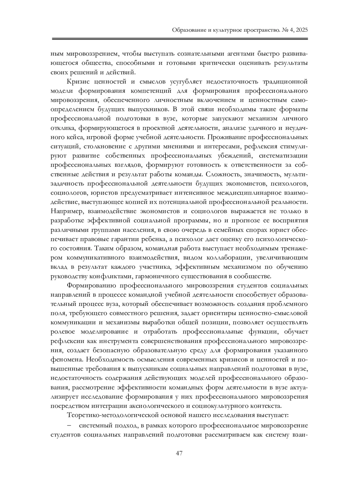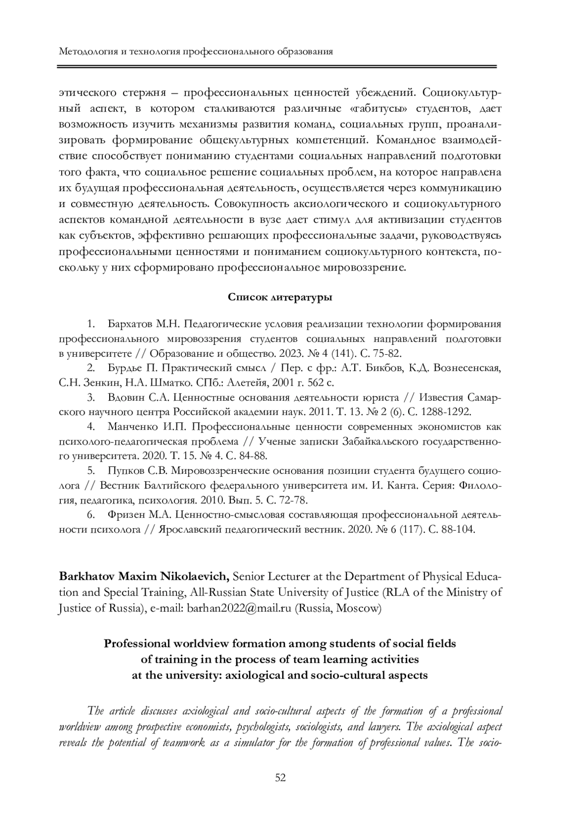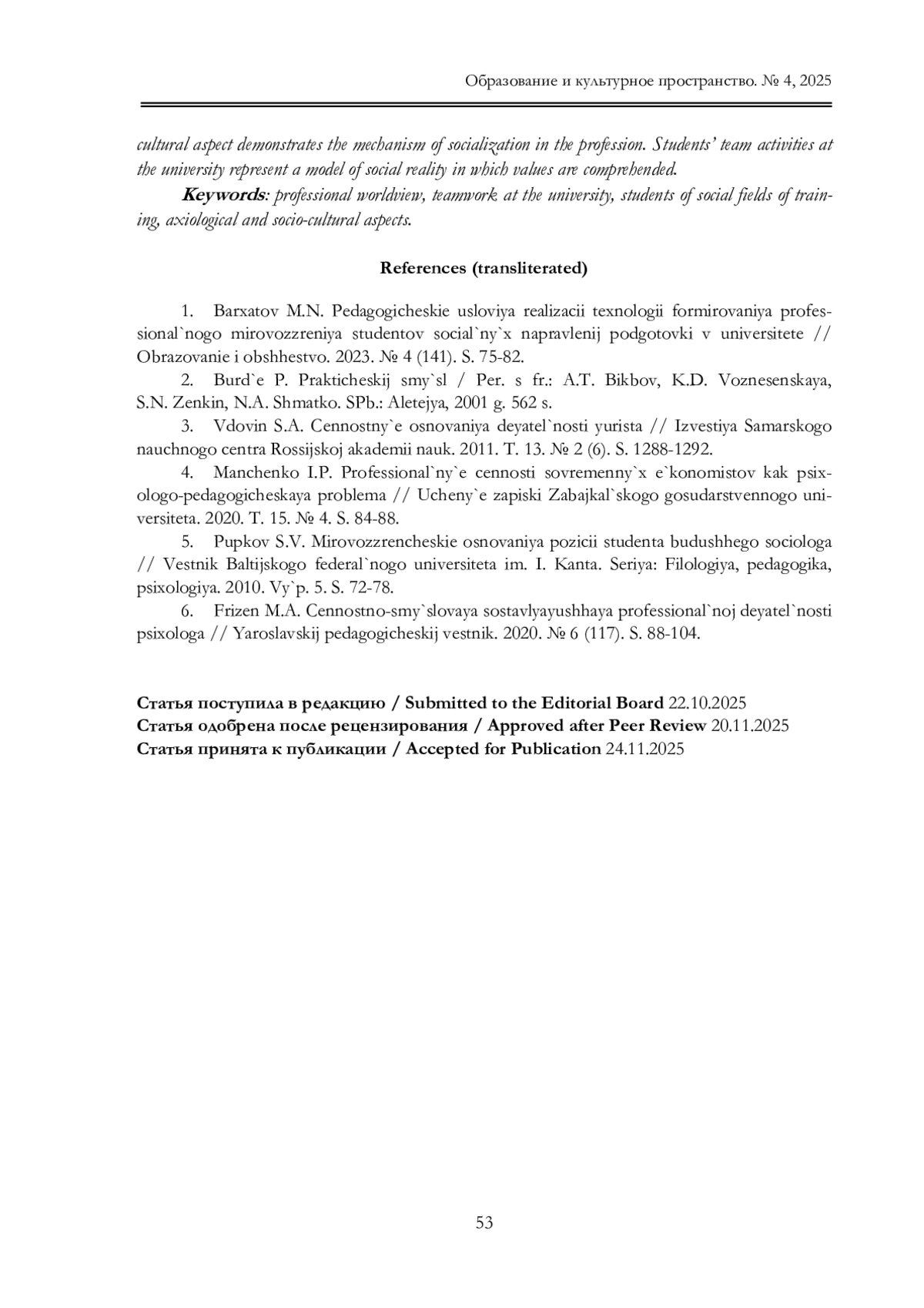 1. Бархатов М.Н. Педагогические условия реализации технологии формирования профессионального мировоззрения студентов социальных направлений подготовки в университете // Образование и общество. 2023. № 4 (141). С. 75-82. EDN: YXDYCA