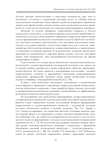 В условиях социокультурной трансформации и роста влияния цифровой медиасреды на процессы социализации молодежи значительно возрастает роль музыки как инструмента воспитательного воздействия. Особенно это актуально в вузовской среде, в которой формирование ценностных ориентиров студентов происходит на пересечении образовательных, культурных и информационных влияний. Современные жанры популярной музыки (поп, рэп и хип-хоп, современный ар-н-би) формируют звуковое окружение большинства представителей «поколения Z» и все чаще становятся каналами эмоциональной и смысловой самоидентификации.