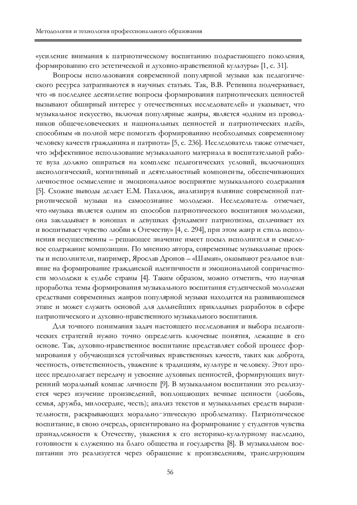 5. Ретивина В.В. Русское музыкальное искусство как средство патриотического воспитания студентов вузов // Проблемы современного педагогического образования. 2021. № 72-4. С. 235-238. EDN: MSBJCV