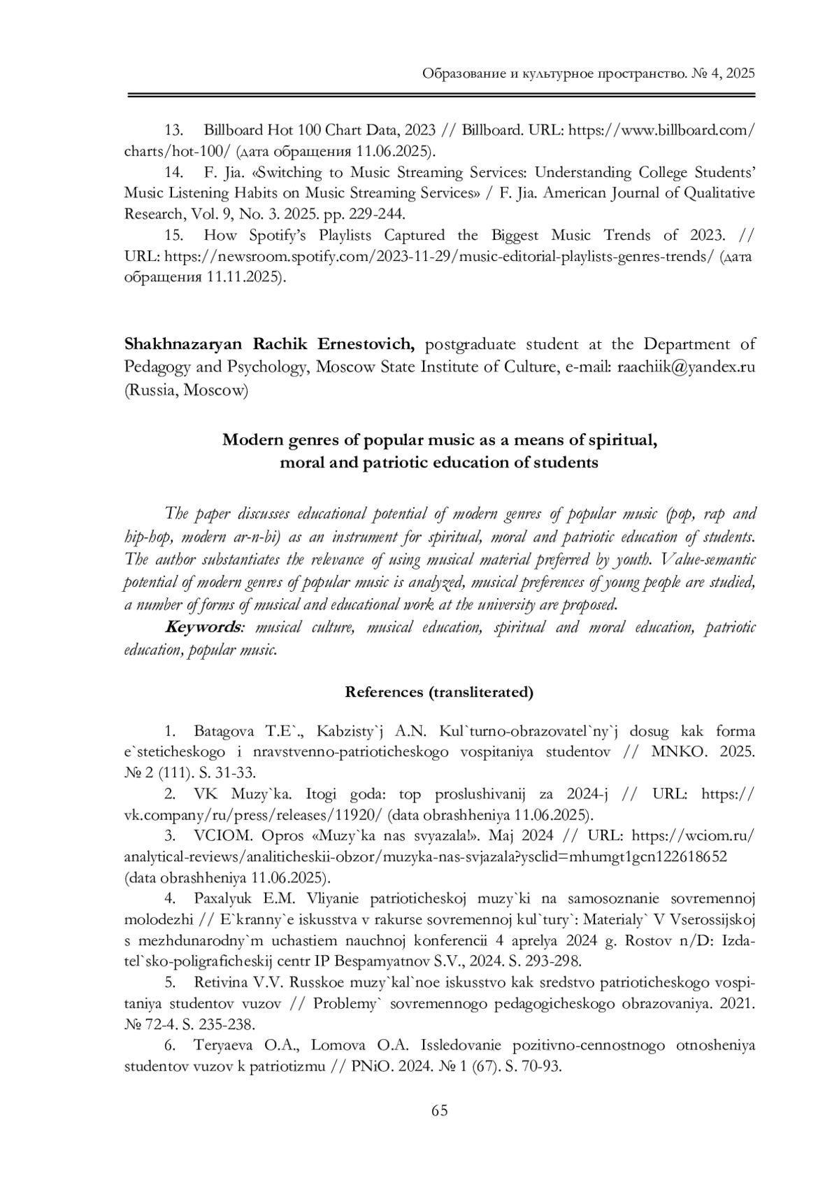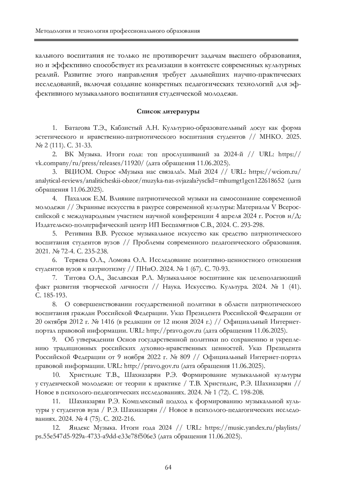 11. Шахназарян Р.Э. Комплексный подход к формированию музыкальной культуры у студентов вуза / Р.Э. Шахназарян // Новое в психолого-педагогических исследованиях. 2024. № 4 (75). С. 202-216. EDN: ASNWES