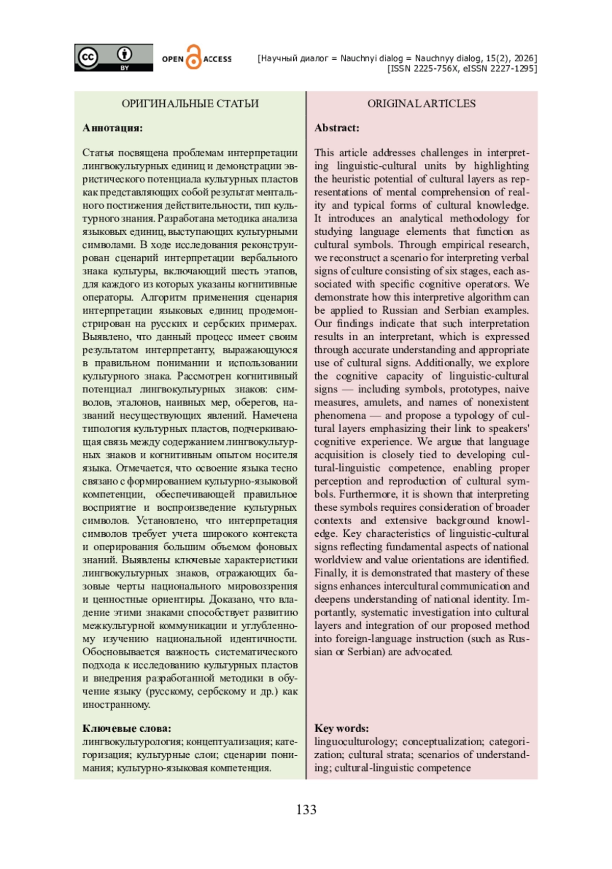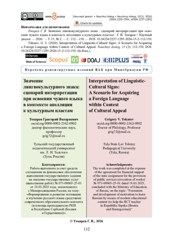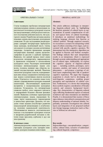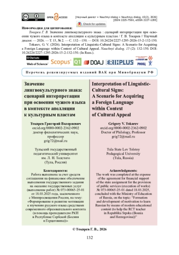 Статья посвящена проблемам интерпретации лингвокультурных единиц и демонстрации эвристического потенциала культурных пластов как представляющих собой результат ментального постижения действительности, тип культурного знания. Разработана методика анализа языковых единиц, выступающих культурными символами. В ходе исследования реконструирован сценарий интерпретации вербального знака культуры, включающий шесть этапов, для каждого из которых указаны когнитивные операторы. Алгоритм применения сценария интерпретации языковых единиц продемонстрирован на русских и сербских примерах. Выявлено, что данный процесс имеет своим результатом интерпретанту, выражающуюся в правильном понимании и использовании культурного знака. Рассмотрен когнитивный потенциал лингвокультурных знаков: символов, эталонов, наивных мер, оберегов, названий несуществующих явлений. Намечена типология культурных пластов, подчеркивающая связь между содержанием лингвокультурных знаков и когнитивным опытом носителя языка. Отмечается, что освоение языка тесно связано с формированием культурно-языковой компетенции, обеспечивающей правильное восприятие и воспроизведение культурных символов. Установлено, что интерпретация символов требует учета широкого контекста и оперирования большим объемом фоновых знаний. Выявлены ключевые характеристики лингвокультурных знаков, отражающих базовые черты национального мировоззрения и ценностные ориентиры. Доказано, что владение этими знаками способствует развитию межкультурной коммуникации и углубленному изучению национальной идентичности. Обосновывается важность систематического подхода к исследованию культурных пластов и внедрения разработанной методики в обучение языку (русскому, сербскому и др.) как иностранному.