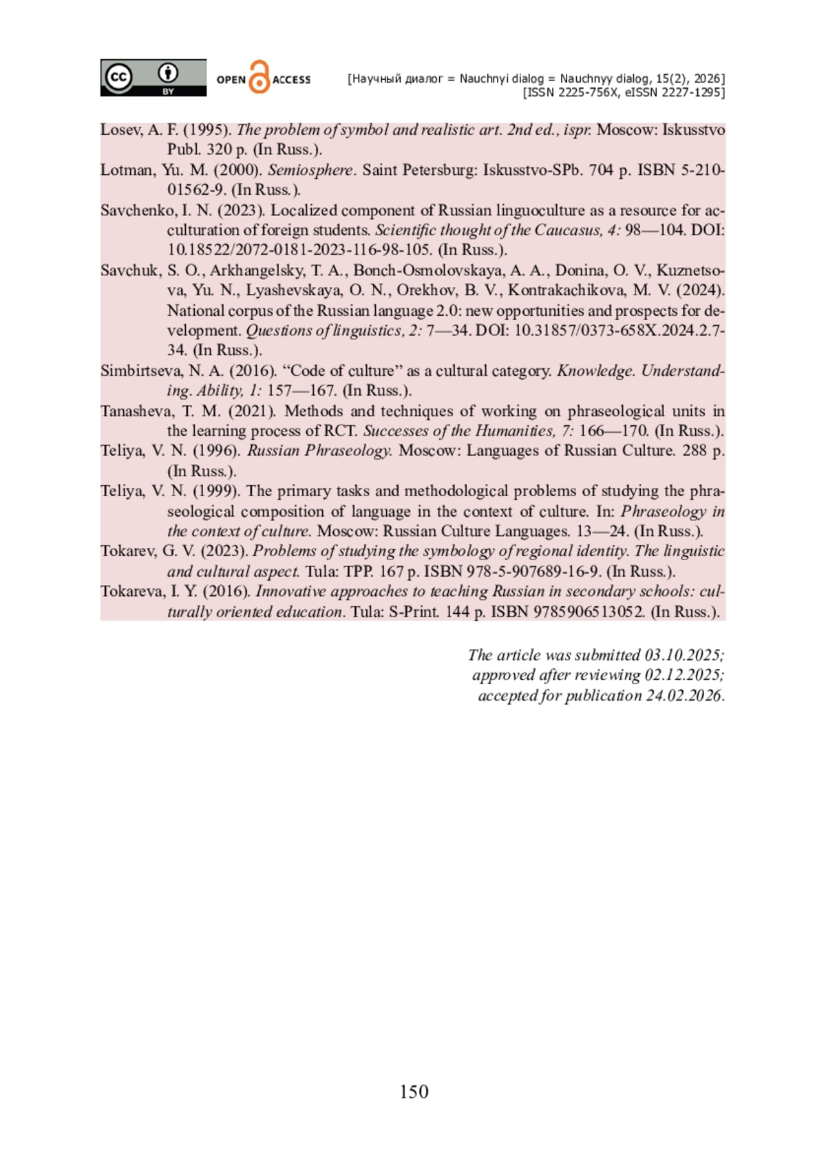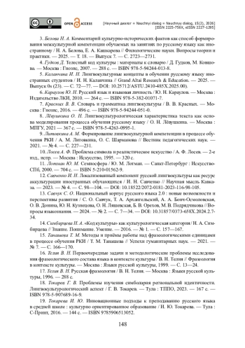 12. Савченко И. Н. Локализованный компонент русской лингвокультуры как ресурс аккультурации иностранных обучающихся / И. Н. Савченко // Научная мысль Кавказа. - 2023. - № 4. - С. 98-104. - https://doi.org/10.18522/2072-0181-2023-116-98-105.