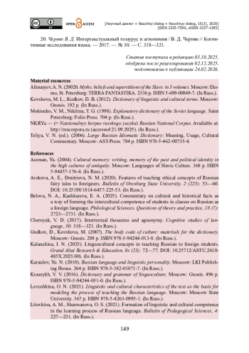 20. Черняк В. Д. Интертекстуальный тезаурус и агнонимия / В. Д. Черняк // Когнитивные исследования языка. - 2017. - № 30. - С. 318-321.