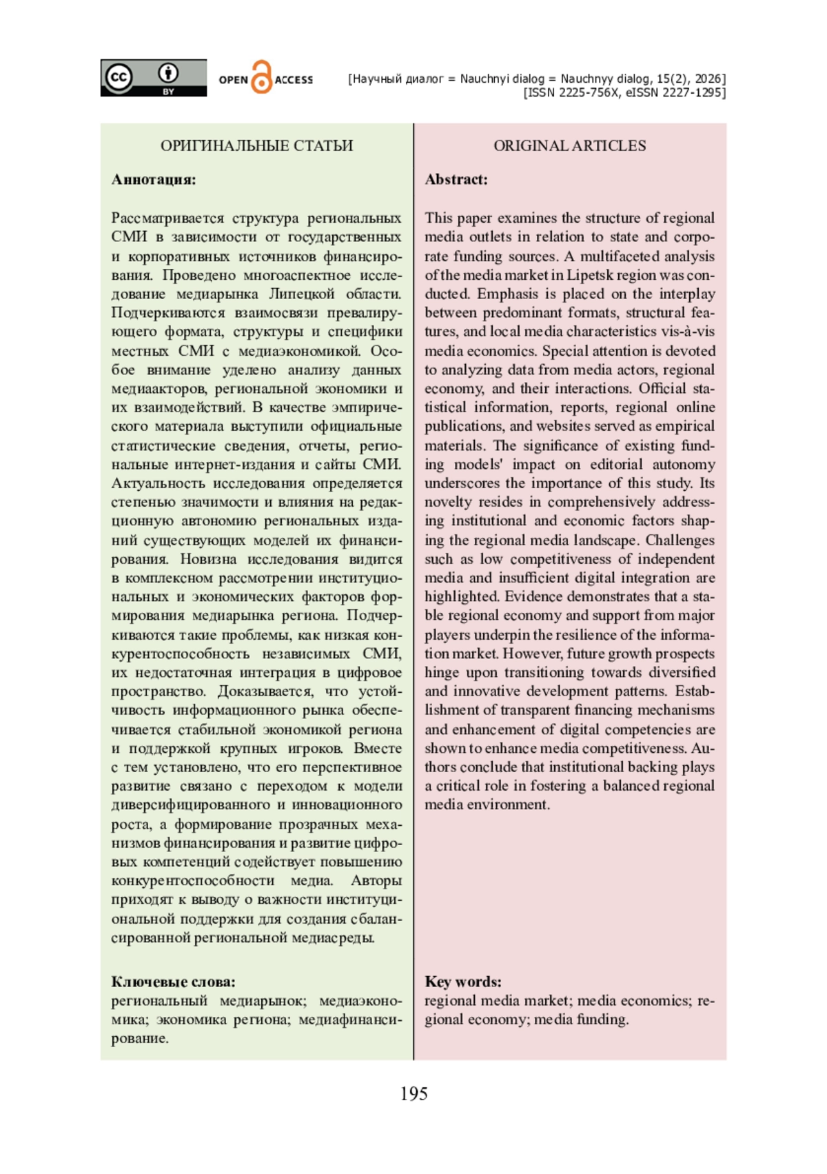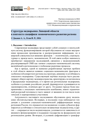 Рассматривается структура региональных СМИ в зависимости от государственных и корпоративных источников финансирования. Проведено многоаспектное исследование медиарынка Липецкой области. Подчеркиваются взаимосвязи превалирующего формата, структуры и специфики местных СМИ с медиаэкономикой. Особое внимание уделено анализу данных медиаакторов, региональной экономики и их взаимодействий. В качестве эмпирического материала выступили официальные статистические сведения, отчеты, региональные интернет-издания и сайты СМИ. Актуальность исследования определяется степенью значимости и влияния на редакционную автономию региональных изданий существующих моделей их финансирования. Новизна исследования видится в комплексном рассмотрении институциональных и экономических факторов формирования медиарынка региона. Подчеркиваются такие проблемы, как низкая конкурентоспособность независимых СМИ, их недостаточная интеграция в цифровое пространство. Доказывается, что устойчивость информационного рынка обеспечивается стабильной экономикой региона и поддержкой крупных игроков. Вместе с тем установлено, что его перспективное развитие связано с переходом к модели диверсифицированного и инновационного роста, а формирование прозрачных механизмов финансирования и развитие цифровых компетенций содействует повышению конкурентоспособности медиа. Авторы приходят к выводу о важности институциональной поддержки для создания сбалансированной региональной медиасреды.