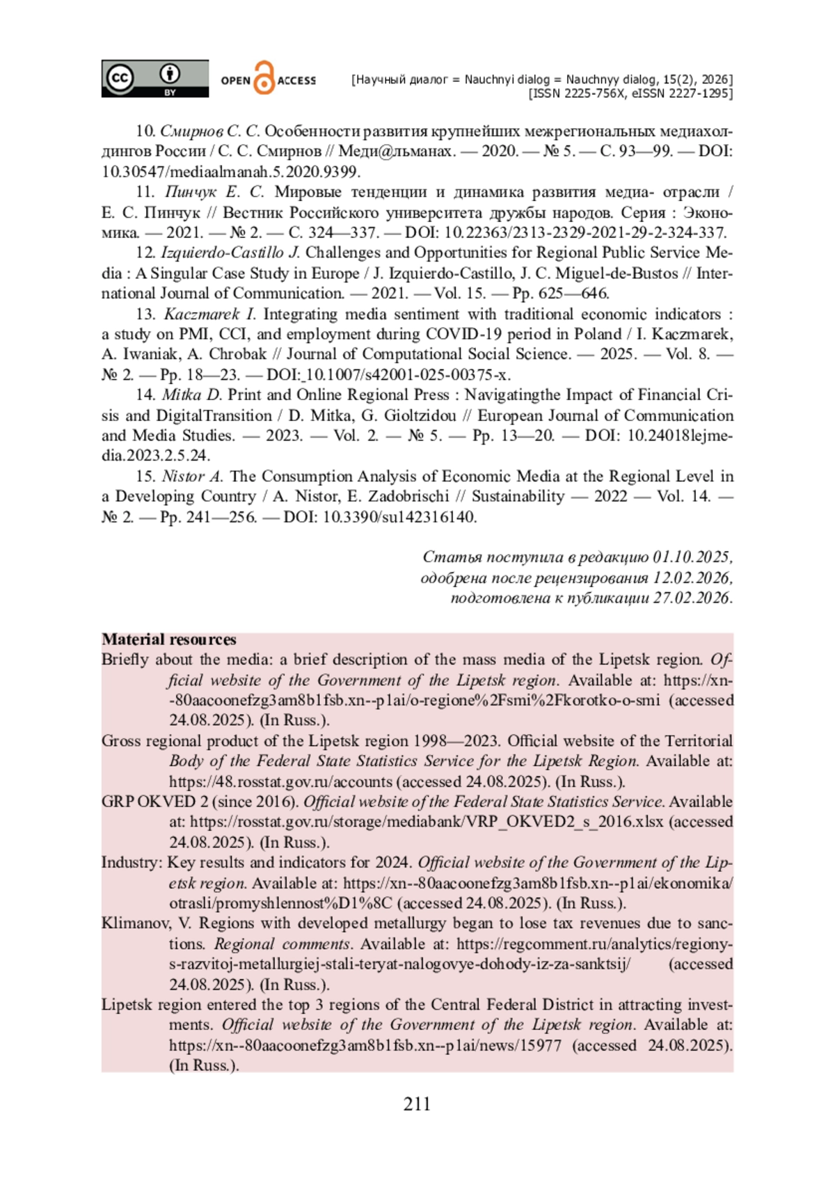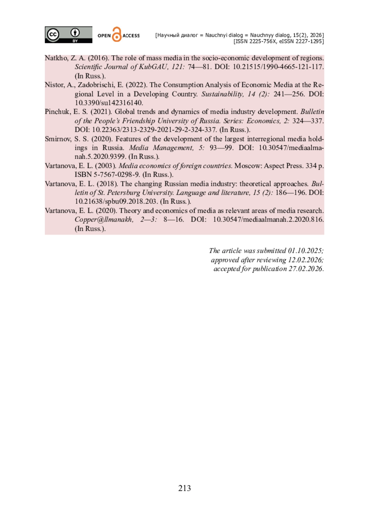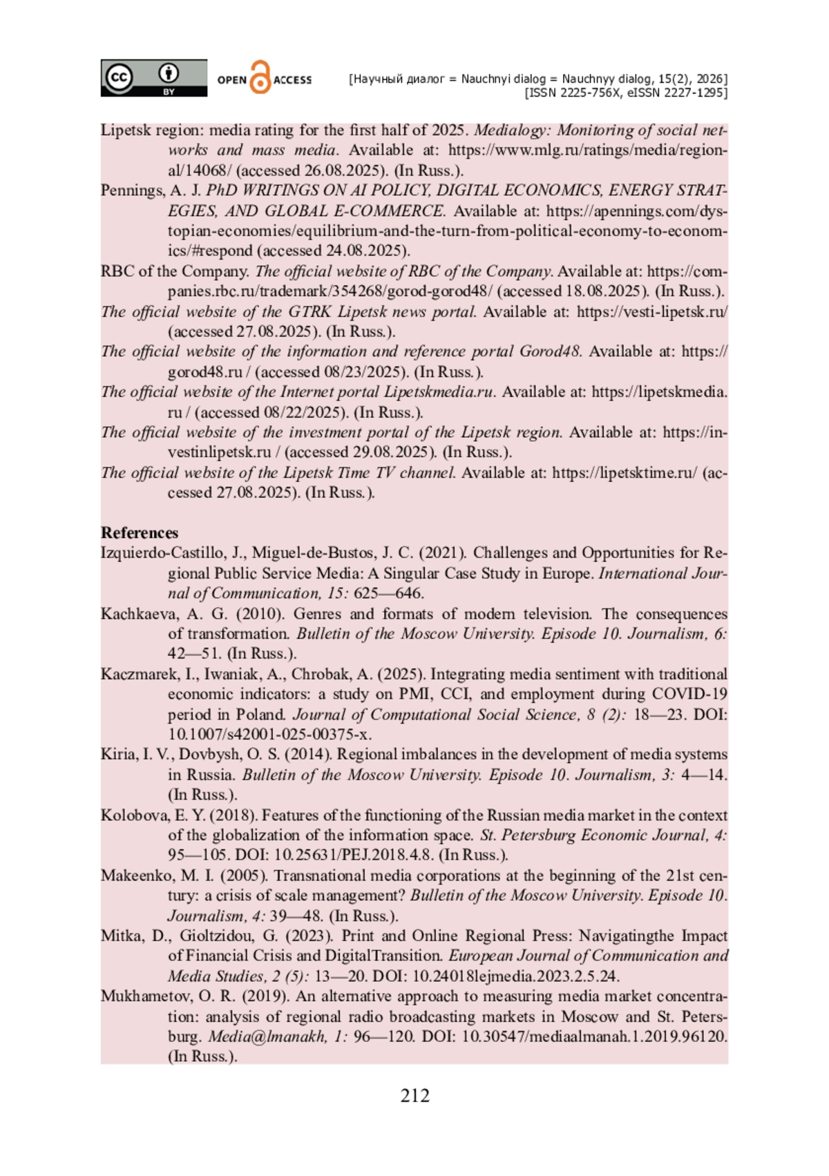 9. Натхо З. А. Роль средств массовой информации в социально-экономическом развитии регионов / З. А. Натхо // Научный журнал КубГАУ. - 2016. - № 121. - С. 74-81. - https://doi.org/10.21515/1990-4665-121-117.