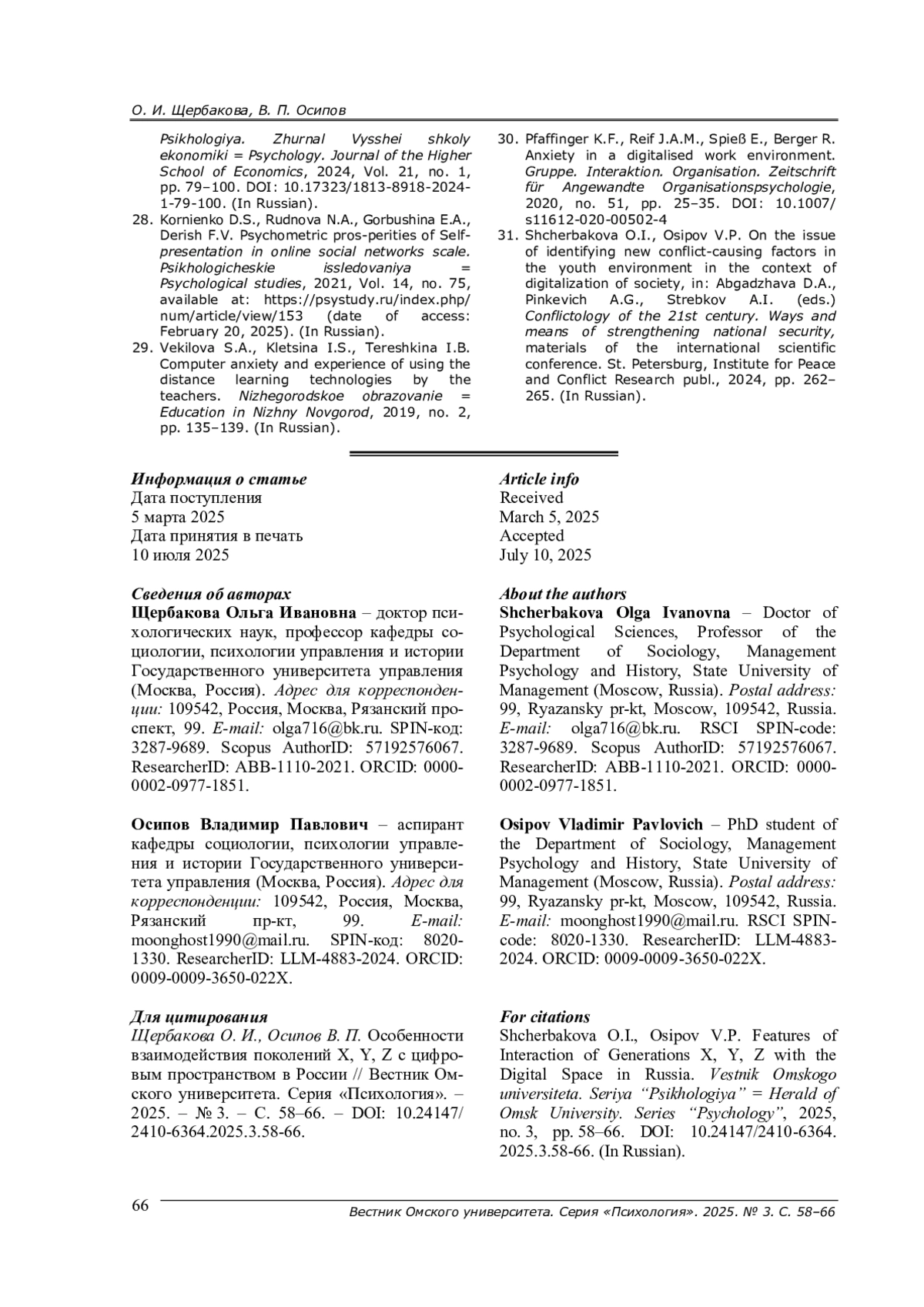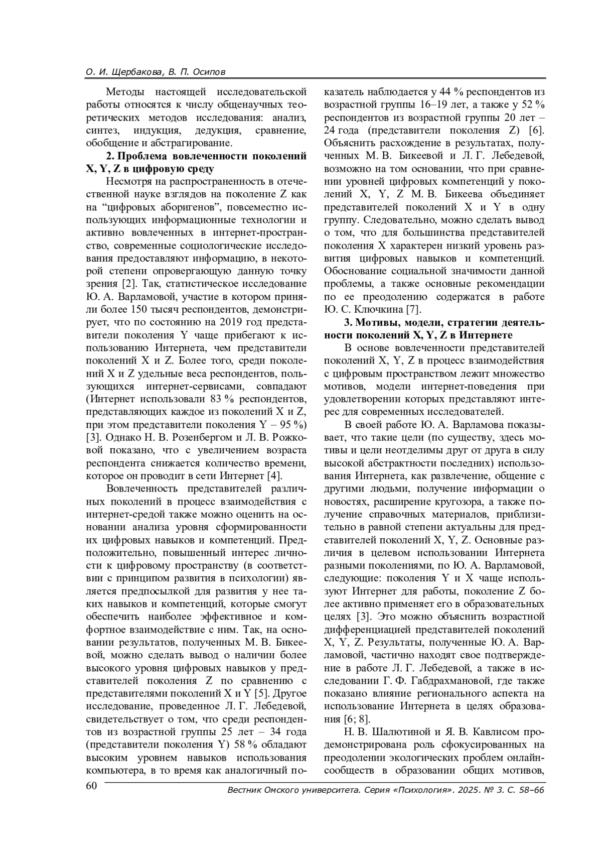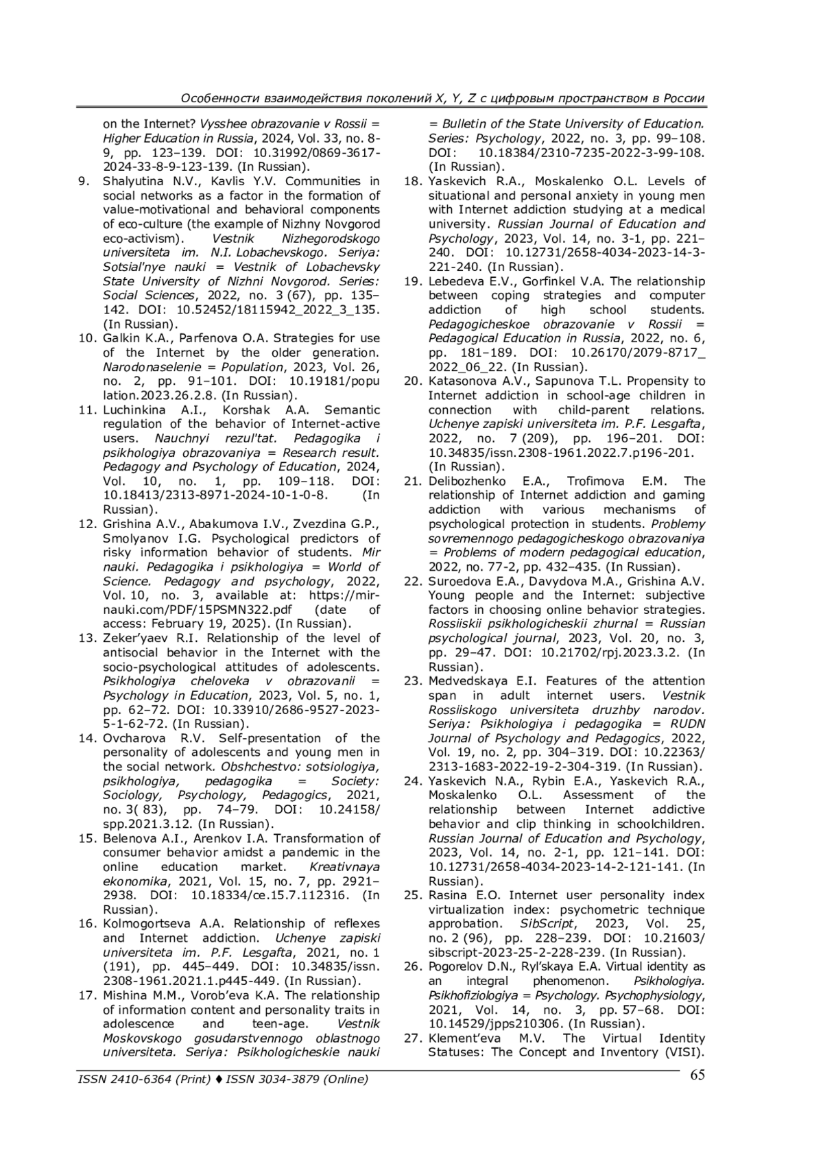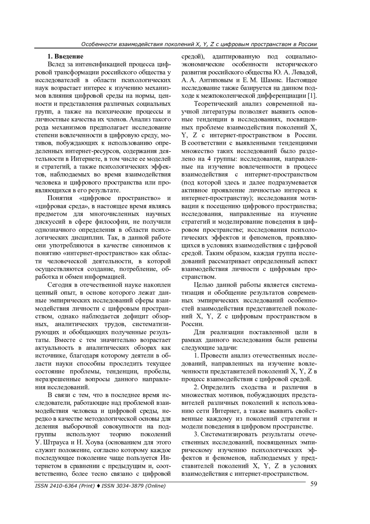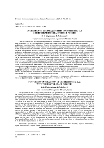 Целью настоящего исследования является систематизация и обобщение результатов современных эмпирических исследований особенностей взаимодействия представителей поколений X, Y, Z с цифровым пространством в России. Анализ отечественной научной литературы, посвященной проблеме вовлеченности указанных поколений в интернет-среду, показал, что все они являются активными интернет-пользователями, однако количество времени, проведенного в Интернете, снижается по мере увеличения возраста личности. Вместе с тем такая тенденция может служить основанием дефицита цифровых навыков и компетенций, который наблюдается у представителей поколения X. Множество мотивов представителей поколений X, Y, Z к деятельности в интернет-пространстве схожи, за исключением того, что представители поколений X и Y чаще используют Интернет для работы, а представители поколения Z - в образовательных целях. Современные исследования в большей степени направлены на изучение моделей поведения поколения Z в цифровой среде, число аналогичных исследований, касающихся поколений X и Y, является весьма ограниченным. В результате взаимодействия представителей различных поколений с цифровым пространством наблюдаются такие психологические феномены, как интернет-зависимость, клиповое мышление, компьютерная тревожность, виртуализация, виртуальная идентичность и цифровая тревожность.