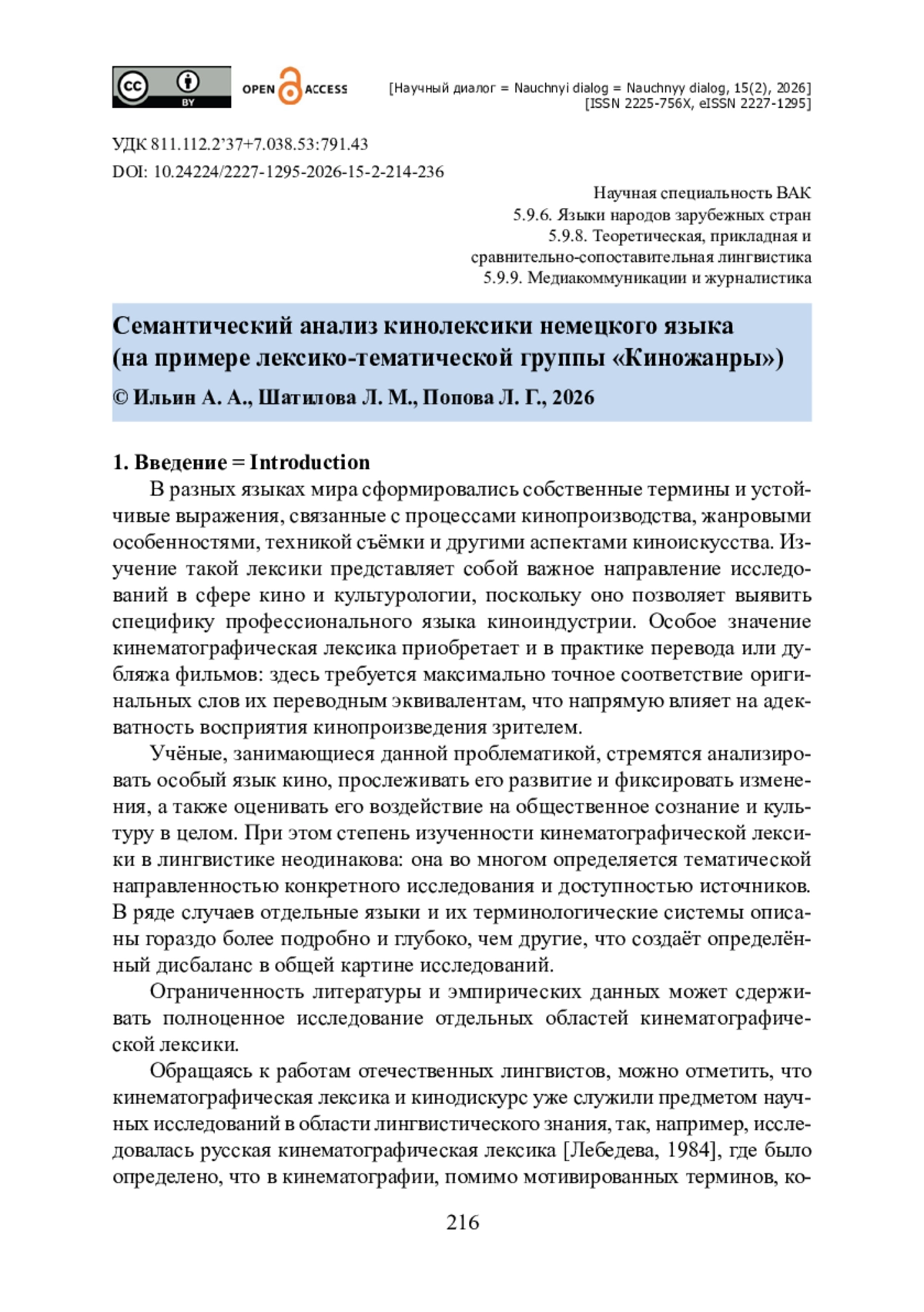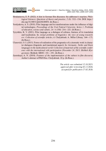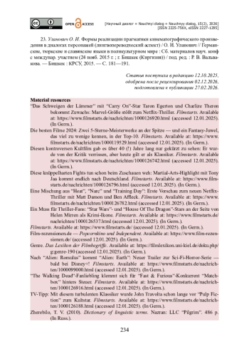 22. Штукатурова Е. П. Намек в немецком кинодискурсе : реакция адресата / Е. П. Штукатурова // Филологические науки. Вопросы теории и практики. - 2022. - № 2 (8). - С. 532-536. - https://doi.org/10.30853/phil20220058.
