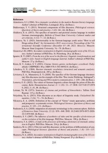 10. Литвинова Е. А. Специфика немецкоязычного документального кинодискурса (на примере фильма „Der zweite Weltkrieg : Stalingrad“) / Е. А. Литвинова, Е. Ю. Мамонова // Перевод, реклама и PR в современной коммуникации. - 2020. - Т. 1. - С. 239-246.