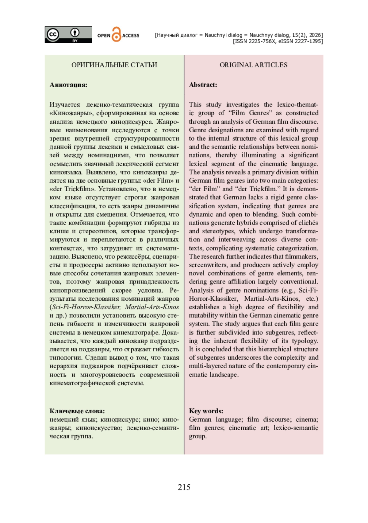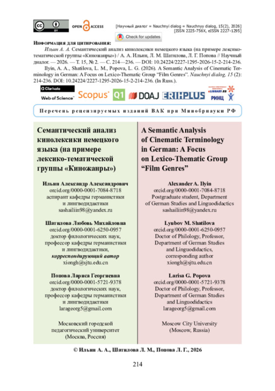 Изучается лексико-тематическая группа «Киножанры», сформированная на основе анализа немецкого кинодискурса. Жанровые наименования исследуются с точки зрения внутренней структурированности данной группы лексики и смысловых связей между номинациями, что позволяет осмыслить значимый лексический сегмент киноязыка. Выявлено, что киножанры делятся на две основные группы: «der Film» и «der Trickfilm». Установлено, что в немецком языке отсутствует строгая жанровая классификация, то есть жанры динамичны и открыты для смешения. Отмечается, что такие комбинации формируют гибриды из клише и стереотипов, которые трансформируются и переплетаются в различных контекстах, что затрудняет их систематизацию. Выяснено, что режиссёры, сценаристы и продюсеры активно используют новые способы сочетания жанровых элементов, поэтому жанровая принадлежность кинопроизведений скорее условна. Результаты исследования номинаций жанров (Sci-Fi-Horror-Klassiker, Martial-Arts-Kinos и др.) позволили установить высокую степень гибкости и изменчивости жанровой системы в немецком кинематографе. Доказывается, что каждый киножанр подразделяется на поджанры, что отражает гибкость типологии. Сделан вывод о том, что такая иерархия поджанров подчёркивает сложность и многоуровневость современной кинематографической системы.