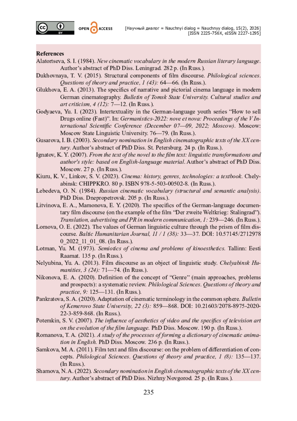 15. Панкратова С. А. Адаптация кинематографической терминологии в общеупотребительной сфере / С. А. Панкратова // Вестник Кемеровского государственного университета. - 2020. - № 22 (3). - С. 859-868. - https://doi.org/10.21603/2078-8975-2020-22-3-859-868.