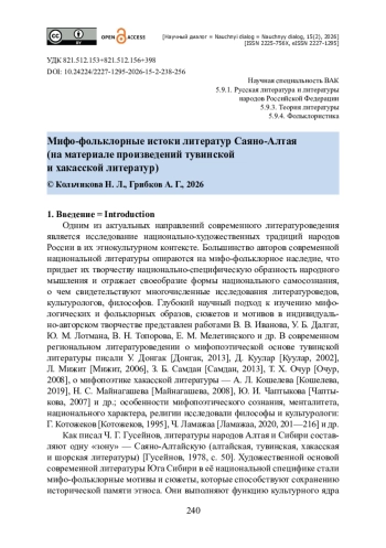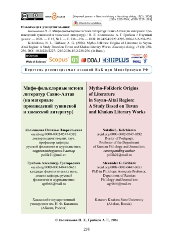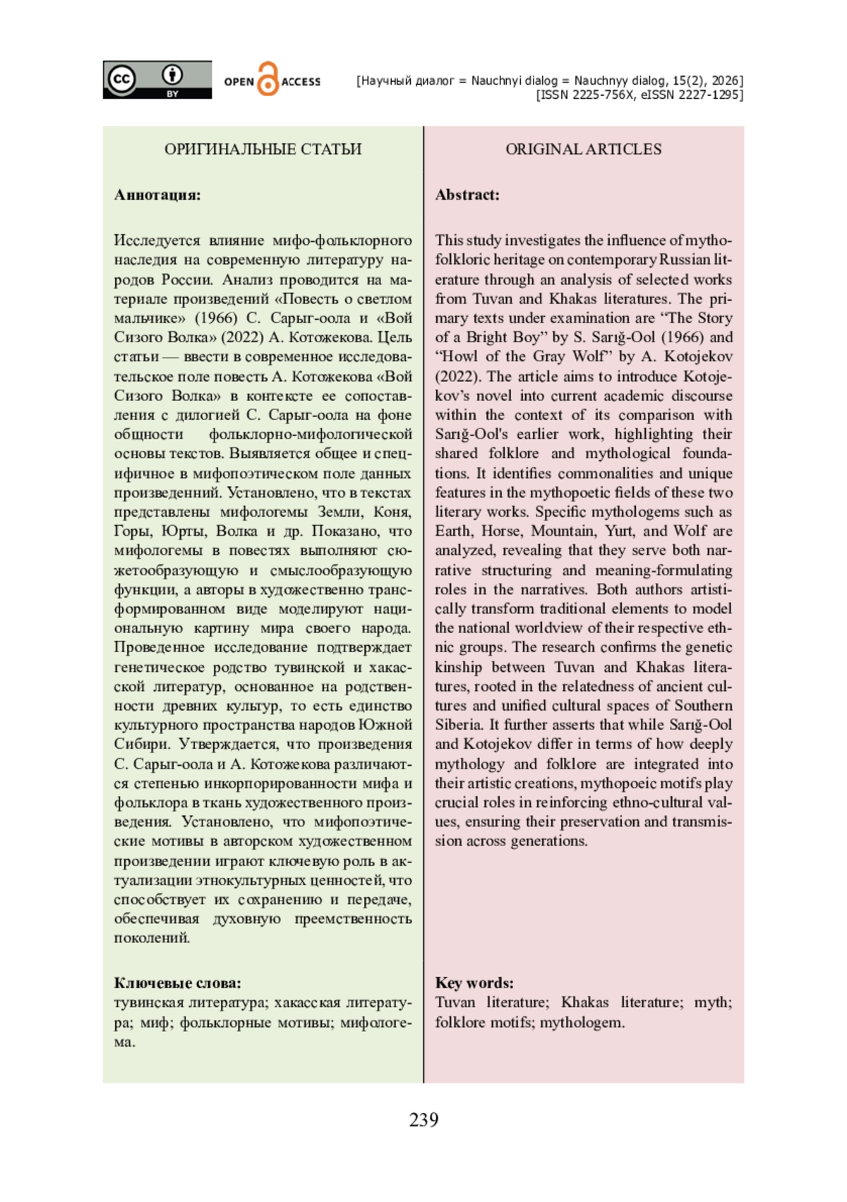 Исследуется влияние мифо-фольклорного наследия на современную литературу народов России. Анализ проводится на материале произведений «Повесть о светлом мальчике» (1966) С. Сарыг-оола и «Вой Сизого Волка» (2022) А. Котожекова. Цель статьи — ввести в современное исследовательское поле повесть А. Котожекова «Вой Сизого Волка» в контексте ее сопоставления с дилогией С. Сарыг-оола на фоне общности фольклорно-мифологической основы текстов. Выявляется общее и специфичное в мифопоэтическом поле данных произведенний. Установлено, что в текстах представлены мифологемы Земли, Коня, Горы, Юрты, Волка и др. Показано, что мифологемы в повестях выполняют сюжетообразующую и смыслообразующую функции, а авторы в художественно трансформированном виде моделируют национальную картину мира своего народа. Проведенное исследование подтверждает генетическое родство тувинской и хакасской литератур, основанное на родственности древних культур, то есть единство культурного пространства народов Южной Сибири. Утверждается, что произведения С. Сарыг-оола и А. Котожекова различаются степенью инкорпорированности мифа и фольклора в ткань художественного произведения. Установлено, что мифопоэтические мотивы в авторском художественном произведении играют ключевую роль в актуализации этнокультурных ценностей, что способствует их сохранению и передаче, обеспечивая духовную преемственность поколений.