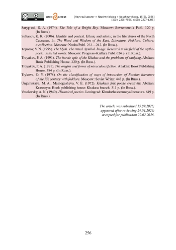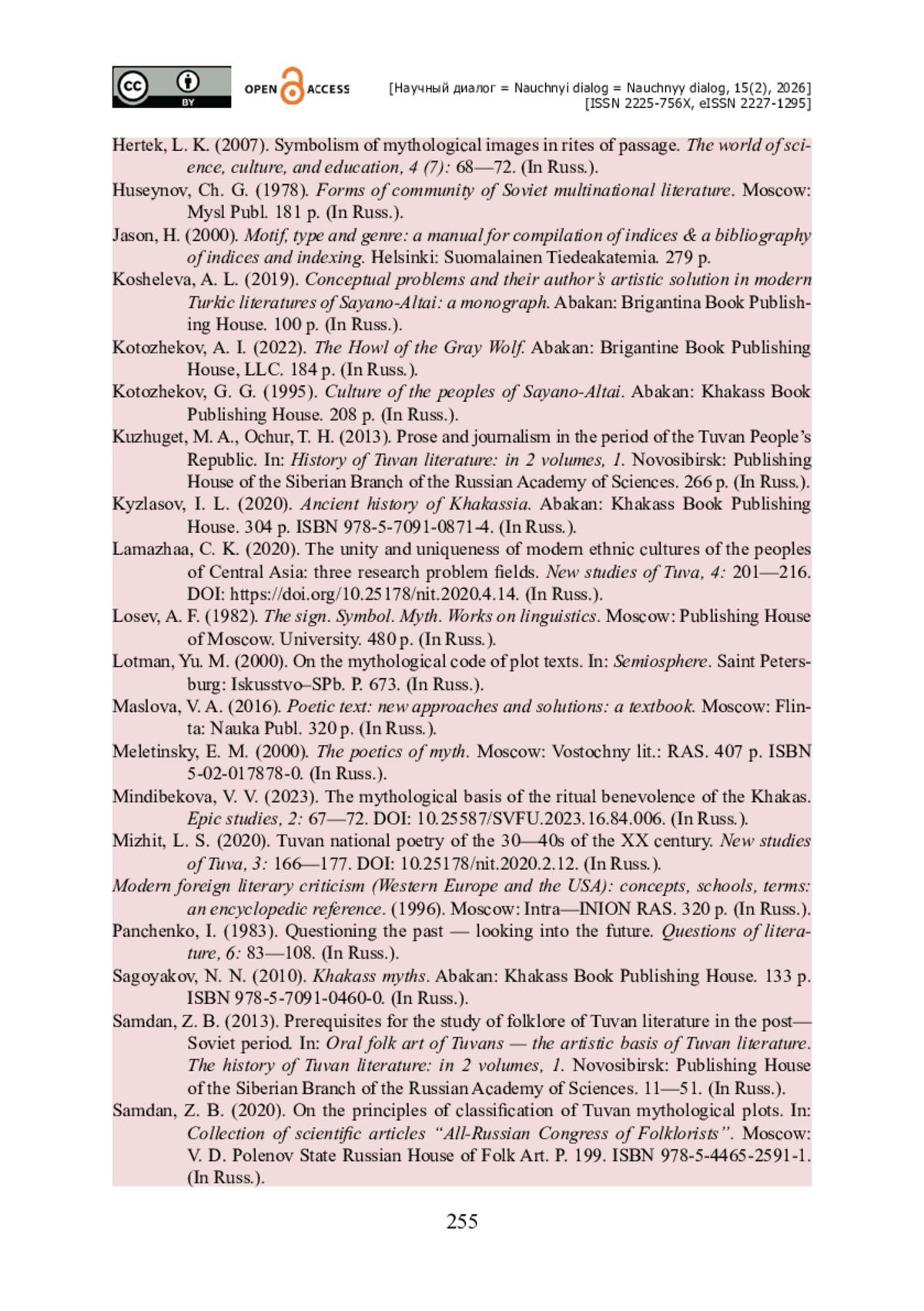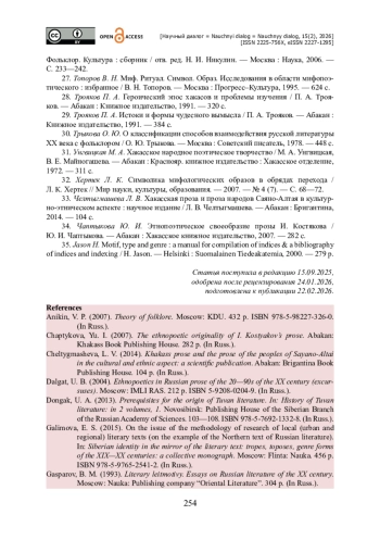 18. Миндибекова В. В. Мифологическая основа обрядовых благопожеланий хакасов / В. В. Миндибекова // Эпосоведение. - 2023. - № 2. - С. 67-72. - https://doi.org/10.25587/SVFU.2023.16.84.006.