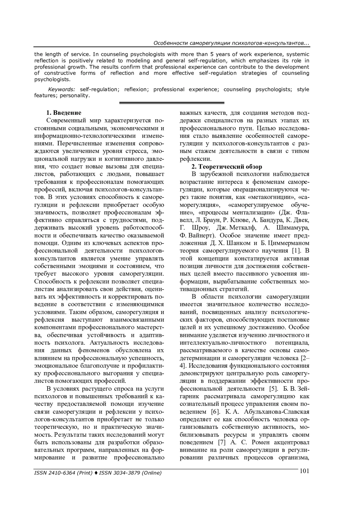 Современные условия профессиональной деятельности психологов-консультантов характеризуются высоким уровнем эмоциональной нагрузки, требуют от них развитой саморегуляции и саморефлексии. Способность управлять собственными состояниями и поведенческими стратегиями, анализировать и корректировать свои действия играет ключевую роль в профессиональной деятельности психологов-консультантов, а также формирует их устойчивость к стрессу и профилактике эмоционального выгорания. Цель исследования - выявление особенностей саморегуляции у психологов-консультантов с разным стажем работы в связи с типом рефлексии. Теоретико-методологической основой работы выступают концепция индивидуального стиля саморегуляции В. И. Моросановой и дифференциальная модель рефлексии Д. А. Леонтьева. Выборку исследования составили 176 практикующих психологов-консультантов в возрасте от 21 до 62 лет (средний возраст -30 лет), 41 мужчина и 135 женщин. Средний стаж работы - 7,67 года. Применялись методики«Дифференциальный тип рефлексии» (Д. А. Леонтьев, Е. М. Лаптева, Е. Н. Осин, А. Ж. Салиханов),«Стиль саморегуляции поведения» (В. И. Моросанова). Выявлено, что психологи-консультанты со стажем работы более 5 лет, по сравнению с начинающими специалистами, имеют более высокий общий уровень саморегуляции, значительнее выраженность таких ее компонентов, как моделирование и гибкость, менее выражены интроспекция и квазирефлексия. Дезадаптивные формы рефлексии (интроспекция и квазирефлексия) у них отрицательно связаны с такими компонентами саморегуляции, как моделирование и гибкость, независимо от стажа деятельности. У психологов-консультантов со стажем работы более 5 лет системная рефлексия положительно связана с программированием и общим уровнем саморегуляции, что подчеркивает ее роль в профессиональном росте. Полученные результаты подтверждают, что профессиональный опыт может способствовать развитию конструктивных форм рефлексии и эффективных стратегий саморегуляции психологов-консультантов.