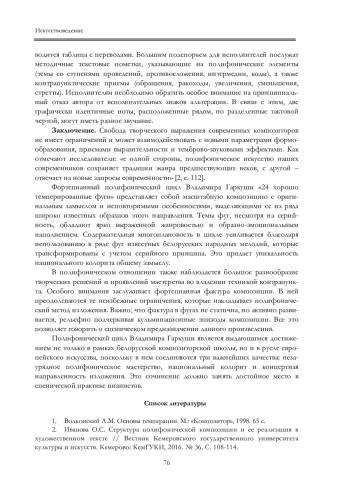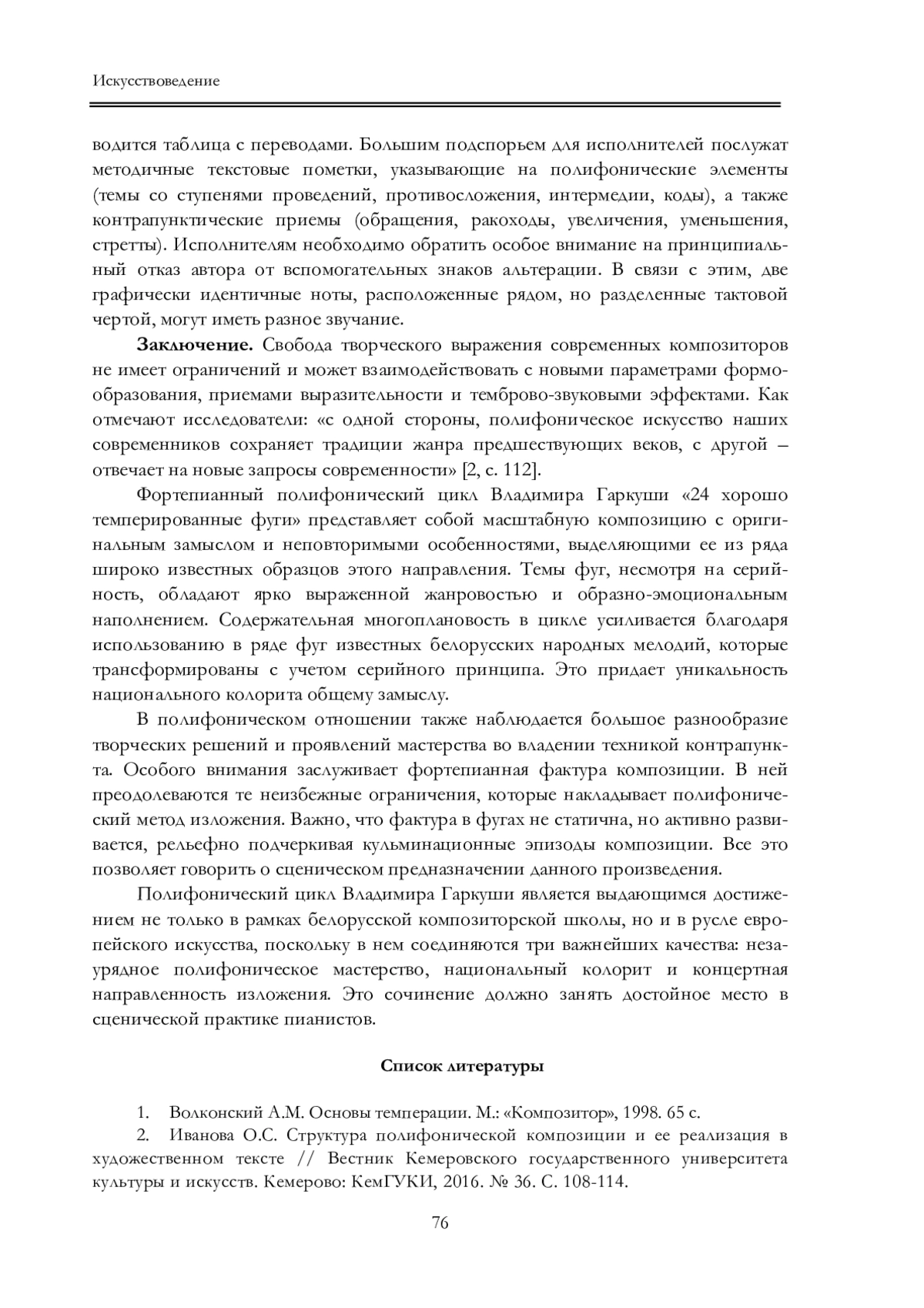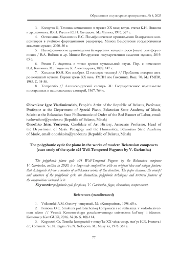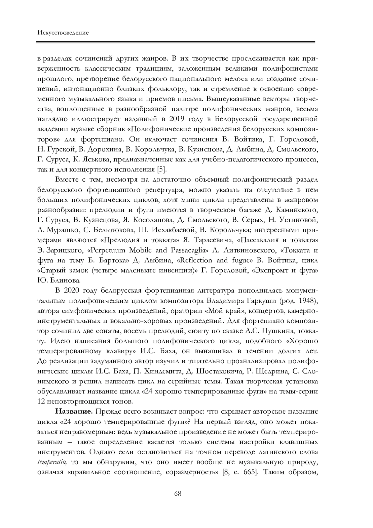 Полифонический цикл для фортепиано «24 хорошо темперированные фуги» белорусского композитора В. Гаркуши, написанный в 2020 году, представляет собой масштабную композицию с оригинальным замыслом и неповторимыми особенностями, выделяющими ее из ряда известных образцов данного направления. В рамках данной статьи мы обратимся к концепции и строению полифонического цикла, рассмотрим тематизм, полифонические приемы и фактурные особенности входящих в него композиций.
