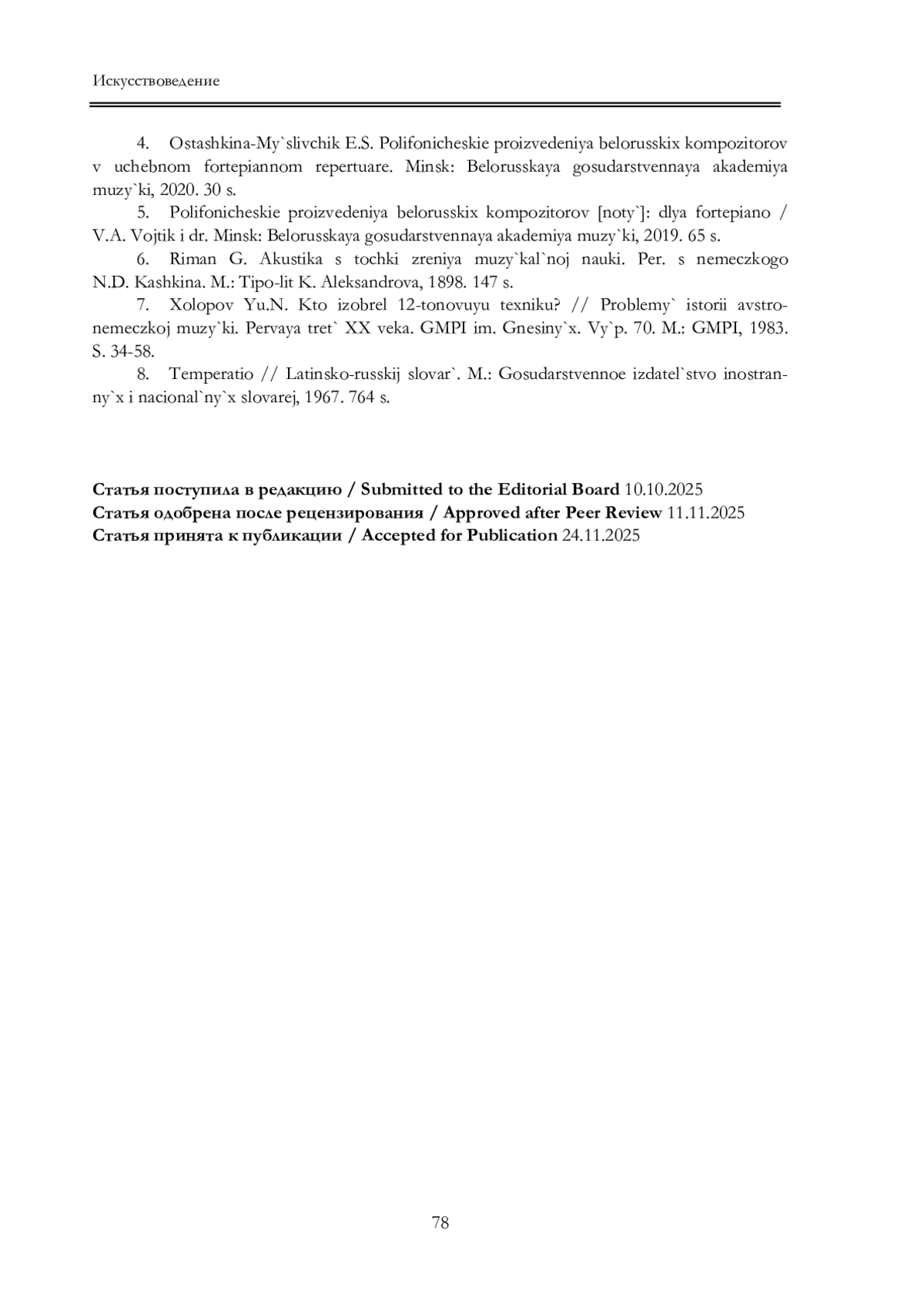 4. Осташкина-Мысливчик Е.С. Полифонические произведения белорусских ком позиторов в учебном фортепианном репертуаре. Минск: Белорусская государственная академия музыки, 2020. 30 с.