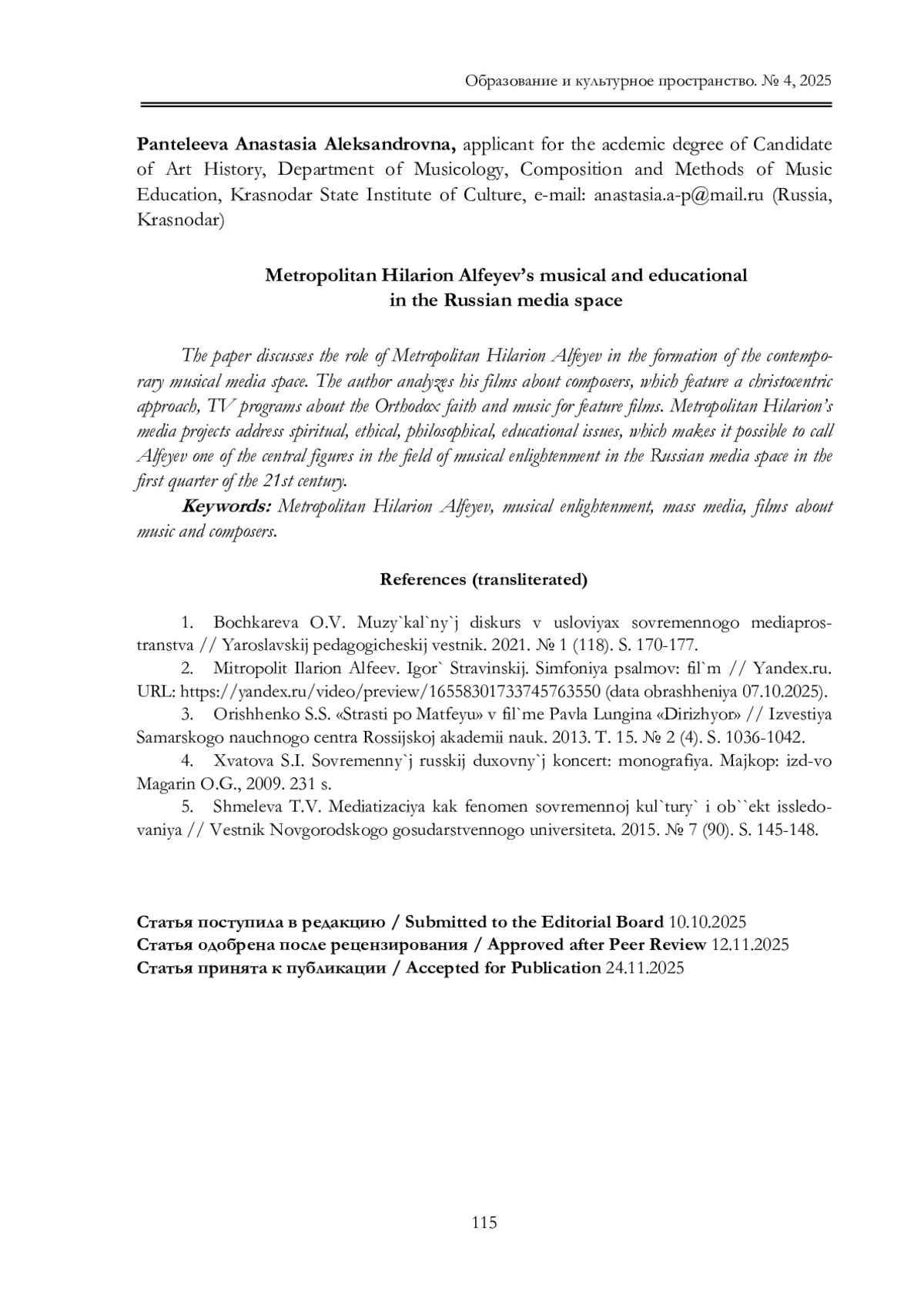 В статье очерчена роль митрополита Илариона Алфеева в формировании современного музыкального медиапространства. Анализируются его фильмы о композиторах, важнейшей особенностью которых стал христоцентричный подход, циклы телепередач о православной вере, музыка к художественному кино. Медиапроекты митрополита Илариона решают духовные, этико-философские, воспитательно-просветительские, образовательные задачи, что позволяет назвать Алфеева одной из центральных фигур в области музыкального просветительства в средствах массовой информации России в первой четверти XXI столетия.
