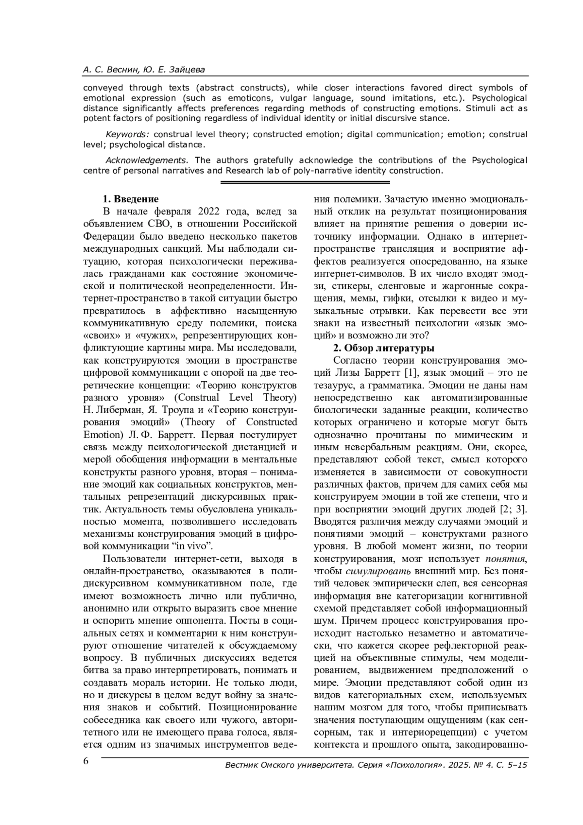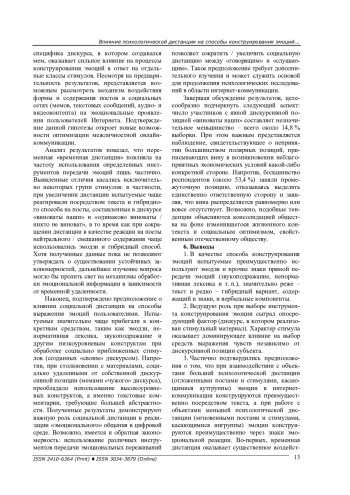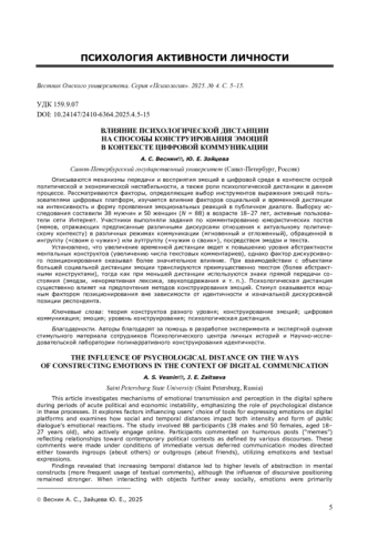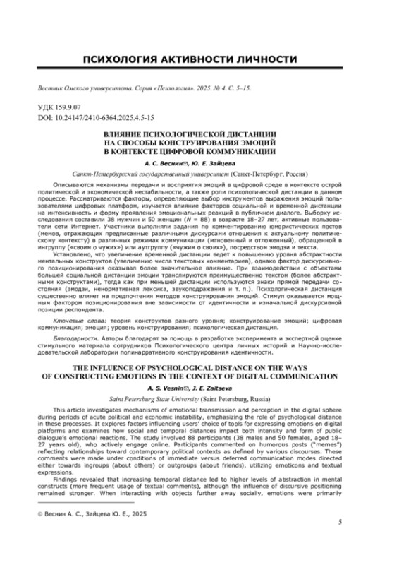 Описываются механизмы передачи и восприятия эмоций в цифровой среде в контексте острой политической и экономической нестабильности, а также роли психологической дистанции в данном процессе. Рассматриваются факторы, определяющие выбор инструментов выражения эмоций пользователями цифровых платформ, изучается влияние факторов социальной и временной дистанции на интенсивность и форму проявления эмоциональных реакций в публичном диалоге. Выборку исследования составили 38 мужчин и 50 женщин ( N = 88) в возрасте 18-27 лет, активные пользователи сети Интернет. Участники выполняли задания по комментированию юмористических постов (мемов, отражающих предписанные различными дискурсами отношения к актуальному политическому контексту) в различных режимах коммуникации (мгновенный и отложенный), обращенной в ингруппу («своим о чужих») или аутгруппу («чужим о своих»), посредством эмодзи и текста.
