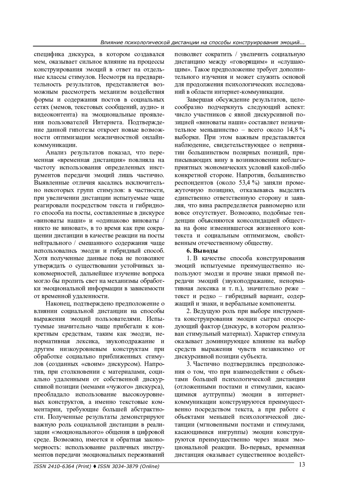 Установлено, что увеличение временной дистанции ведет к повышению уровня абстрактности ментальных конструктов (увеличению числа текстовых комментариев), однако фактор дискурсивного позиционирования оказывал более значительное влияние. При взаимодействии с объектами большей социальной дистанции эмоции транслируются преимущественно текстом (более абстрактными конструктами), тогда как при меньшей дистанции используются знаки прямой передачи состояния (эмодзи, ненормативная лексика, звукоподражания и т. п.). Психологическая дистанция существенно влияет на предпочтения методов конструирования эмоций. Стимул оказывается мощным фактором позиционирования вне зависимости от идентичности и изначальной дискурсивной позиции респондента.