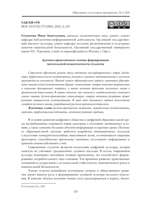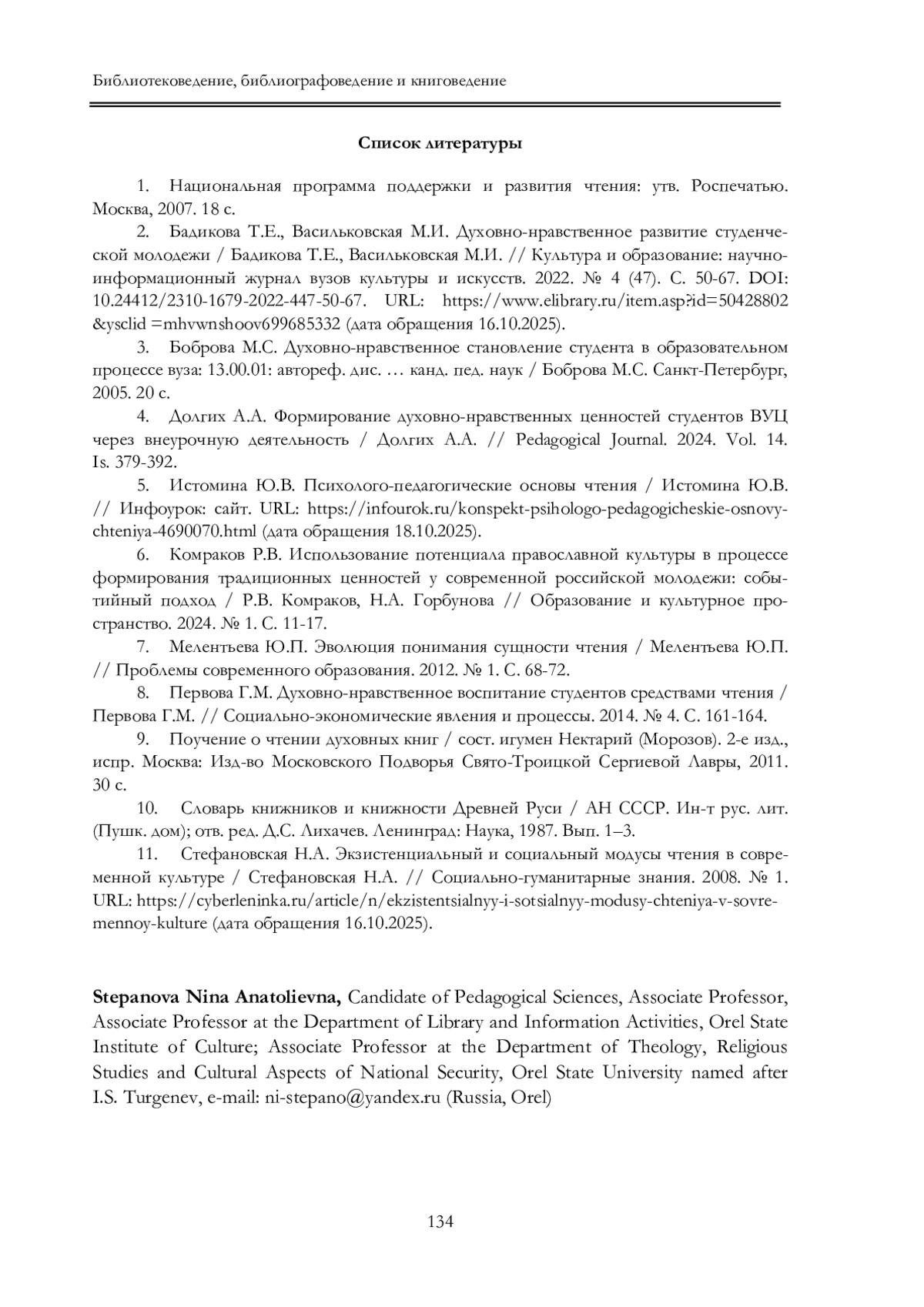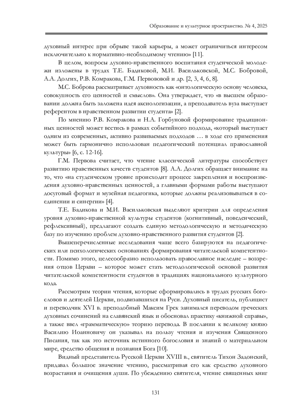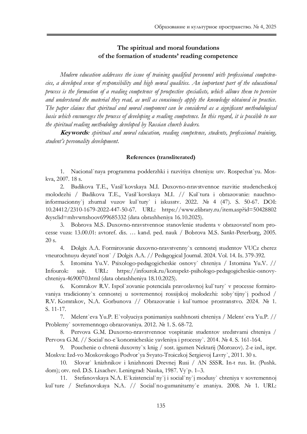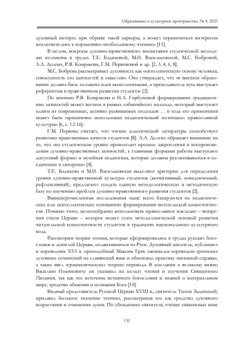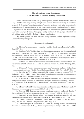 2. Бадикова Т.Е., Васильковская М.И. Духовно-нравственное развитие студенче ской молодежи / Бадикова Т.Е., Васильковская М.И. // Культура и образование: научно информационный журнал вузов культуры и искусств. 2022. № 4 (47). С. 50-67. URL: item.asp?id=50428802 &ysclid =mhvwnshoov699685332 (дата обращения 16.10.2025). DOI: 10.24412/2310-1679-2022-447-50-67 EDN: BLVRBF