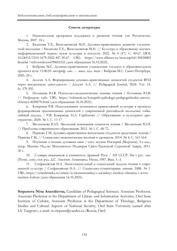 3. Боброва М.С. Духовно-нравственное становление студента в образовательном процессе вуза: 13.00.01: автореф. дис. … канд. пед. наук / Боброва М.С. Санкт-Петербург, 2005. 20 с. EDN: NIIMAX